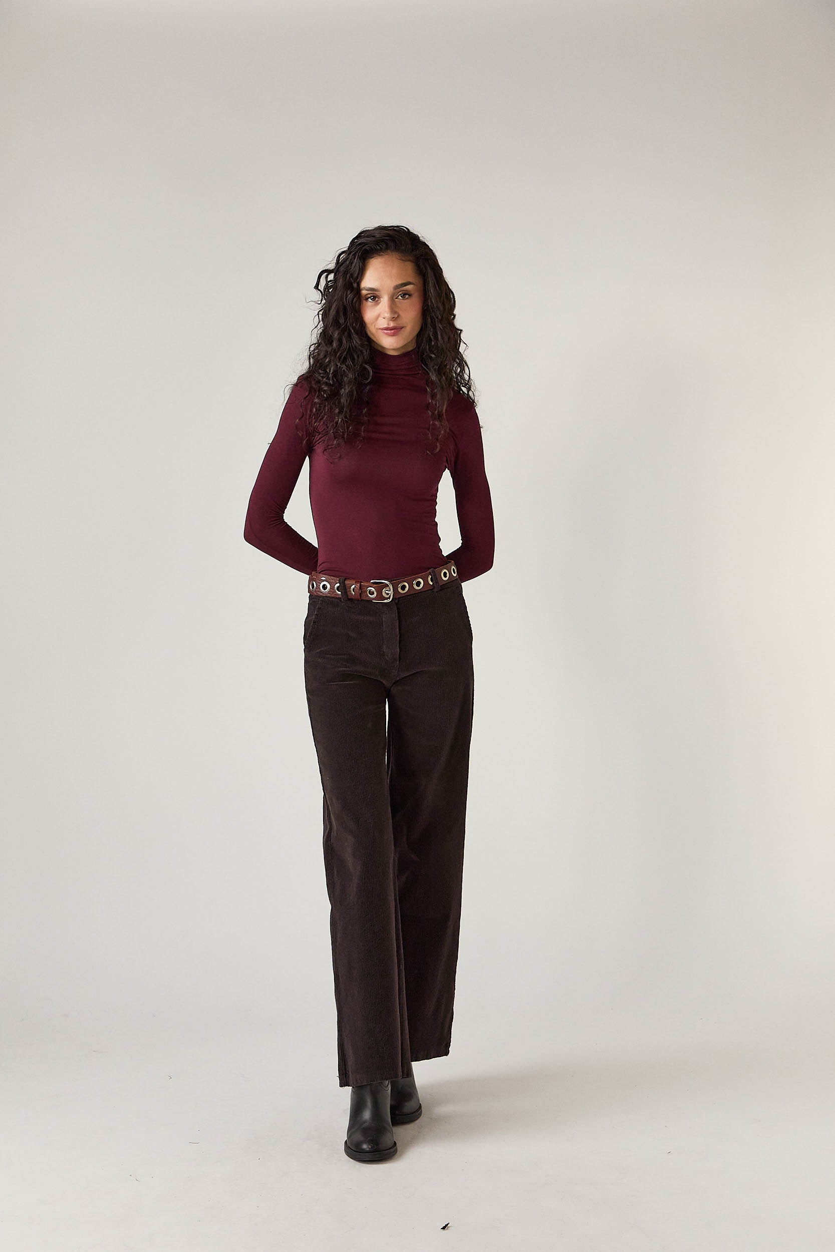 Esta t-shirt de gola alta em tom vinho profundo é perfeita como camada base em dias frios, seja por baixo de uma camisola de malha macia, de um blazer estruturado ou de um colete acolchoado. Ideal para o escritório, para um passeio soalheiro de inverno ou para um jantar descontraído, eleva facilmente calças de alfaiataria, denim escuro ou uma saia midi, criando coordenados elegantes sem esforço.