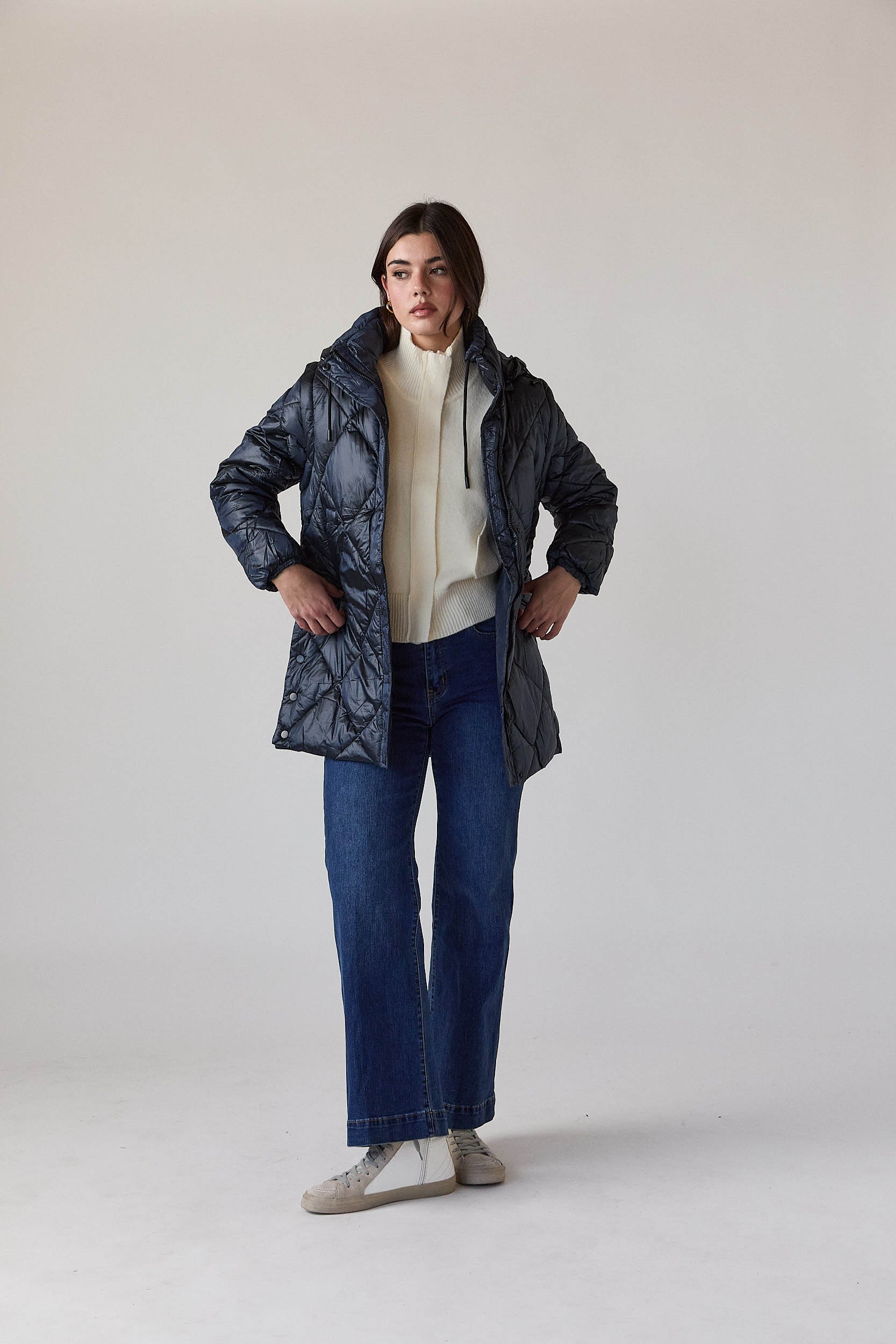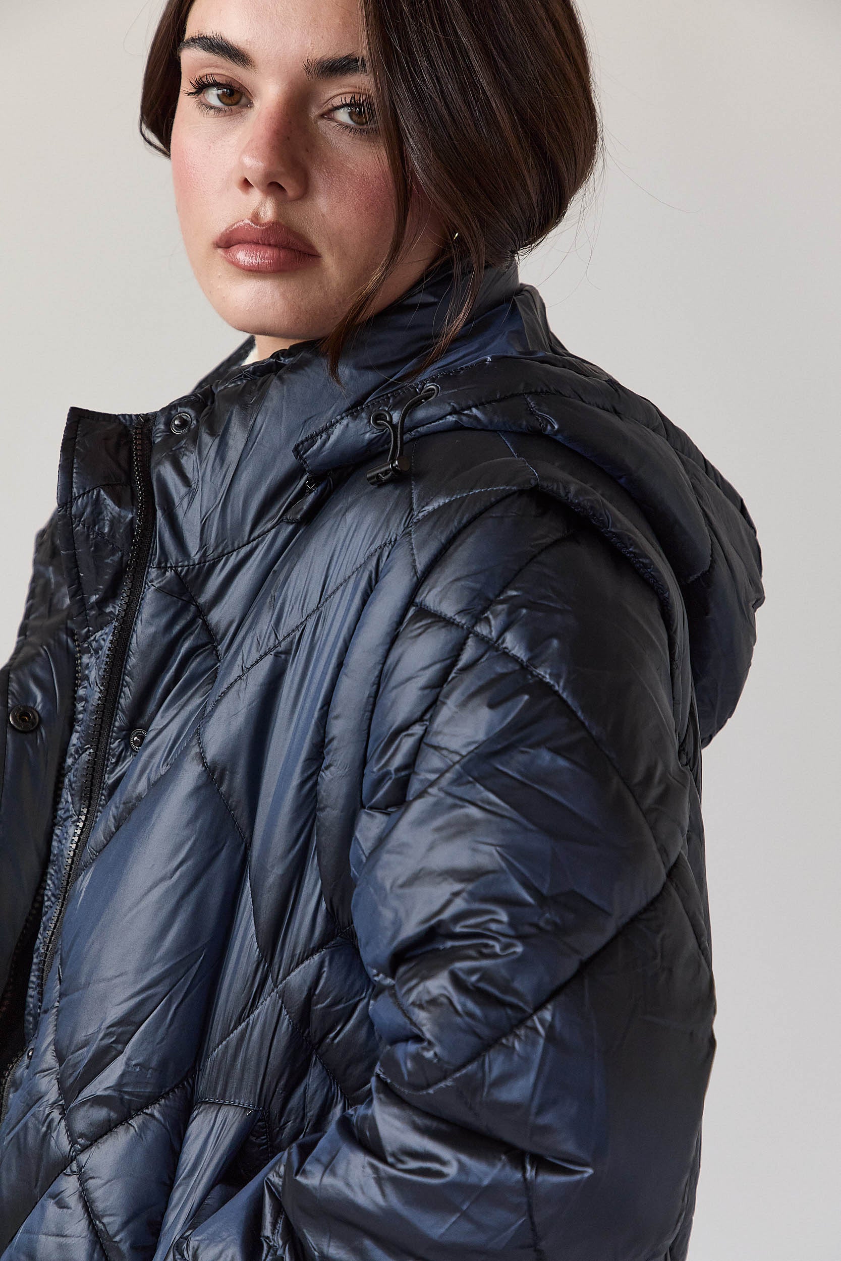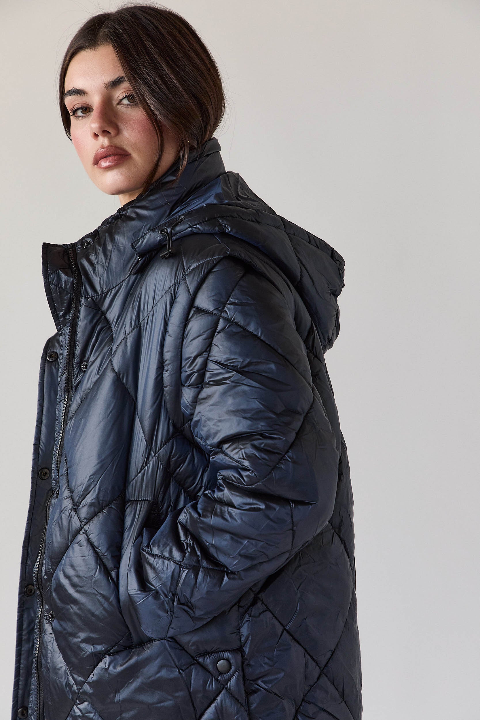 Este casaco acolchoado azul-marinho de corte recto é um casaco de plumas desmontável com pesponto em forma de losangos, capuz ajustável e fecho frontal com fecho de correr e molas ocultas. As mangas removíveis transformam facilmente a peça num colete acolchoado, garantindo versatilidade sem perder a linha elegante, enquanto os bolsos laterais funcionais completam o design prático.