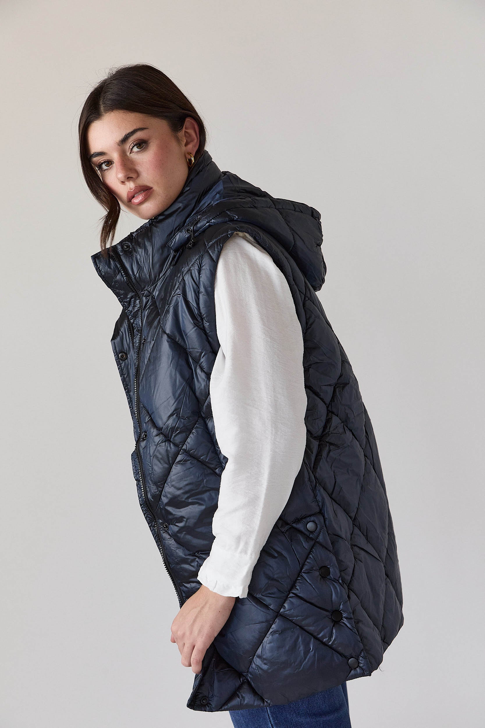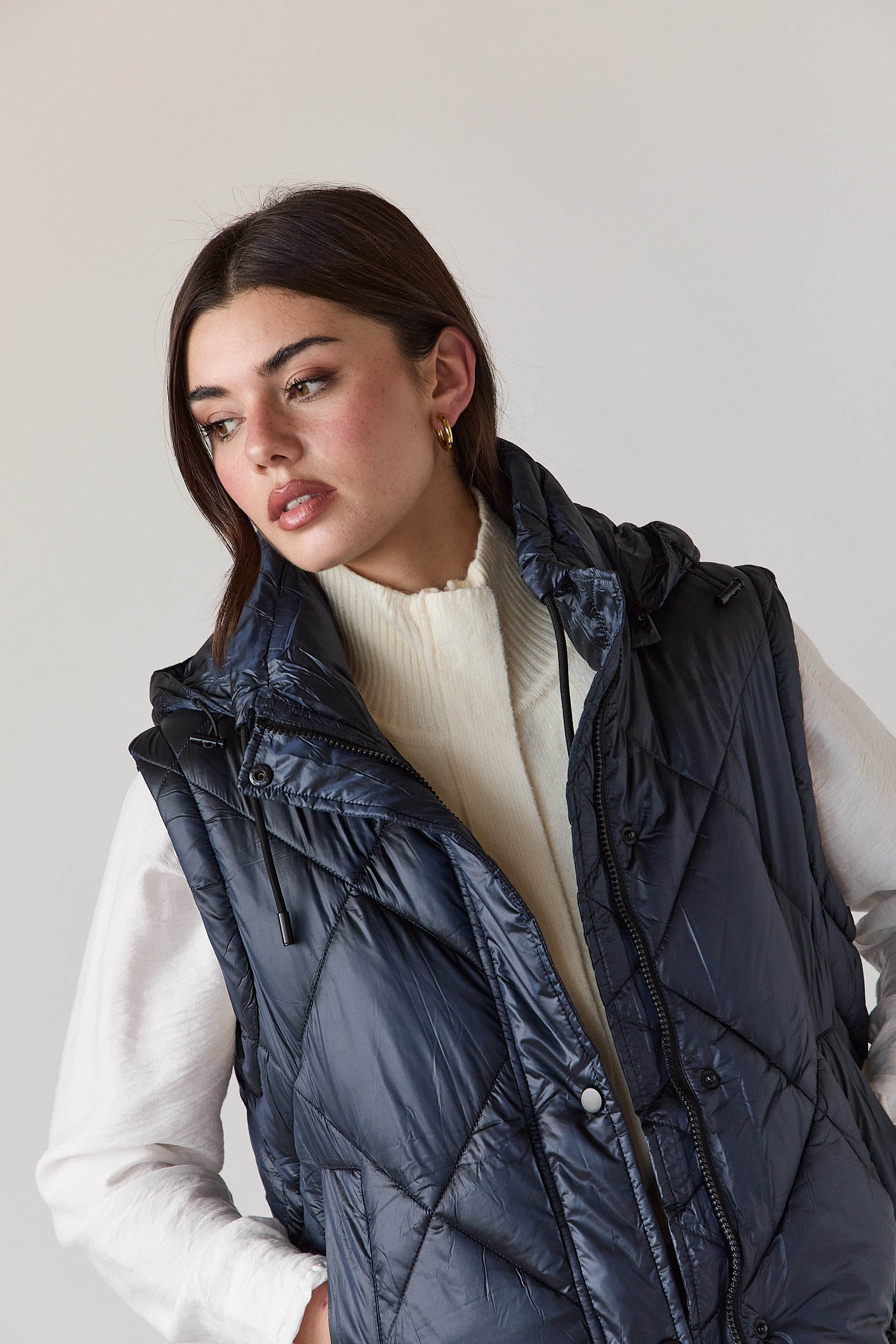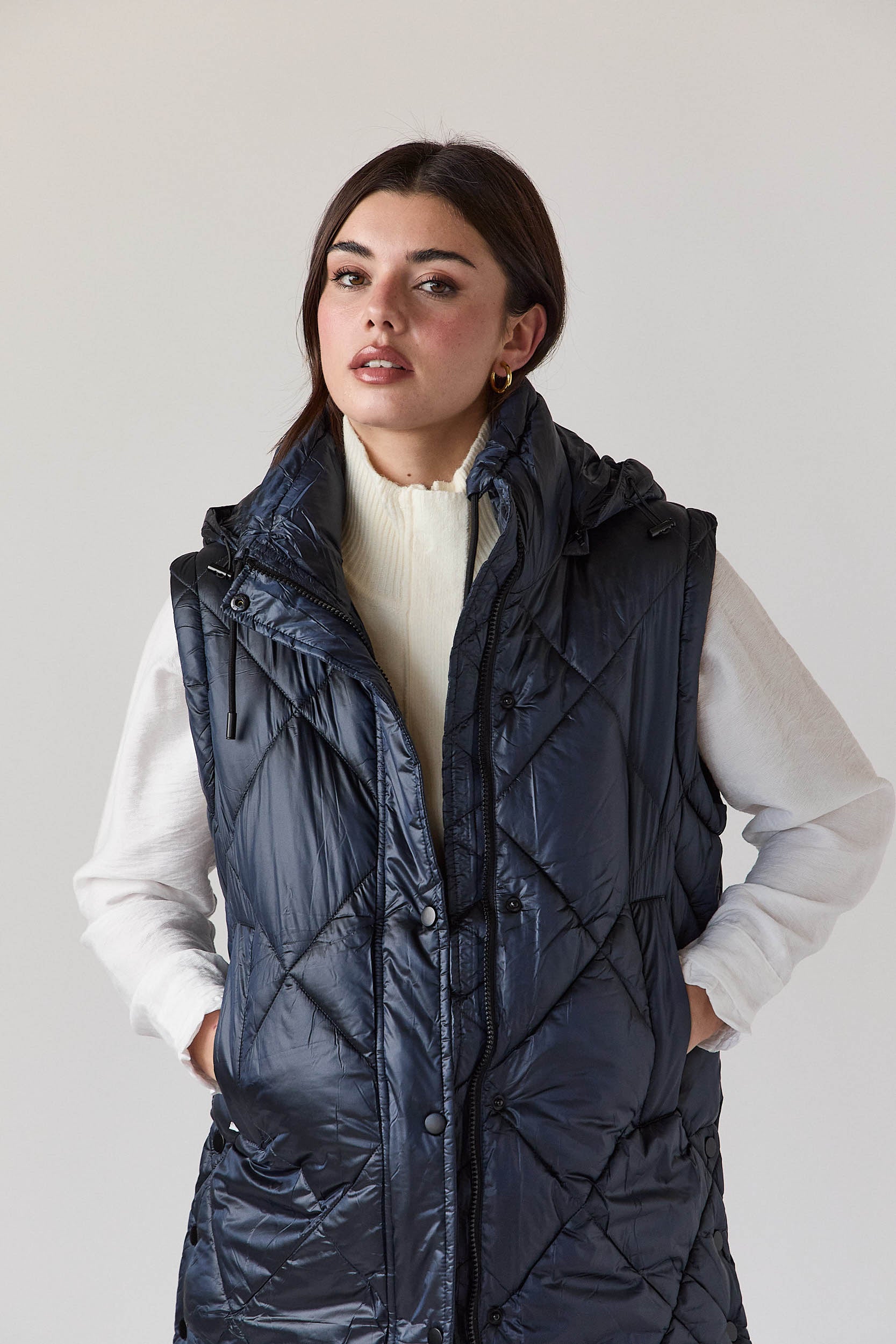 Este casaco acolchoado azul-marinho de corte recto é um casaco de plumas desmontável com pesponto em forma de losangos, capuz ajustável e fecho frontal com fecho de correr e molas ocultas. As mangas removíveis transformam facilmente a peça num colete acolchoado, garantindo versatilidade sem perder a linha elegante, enquanto os bolsos laterais funcionais completam o design prático.