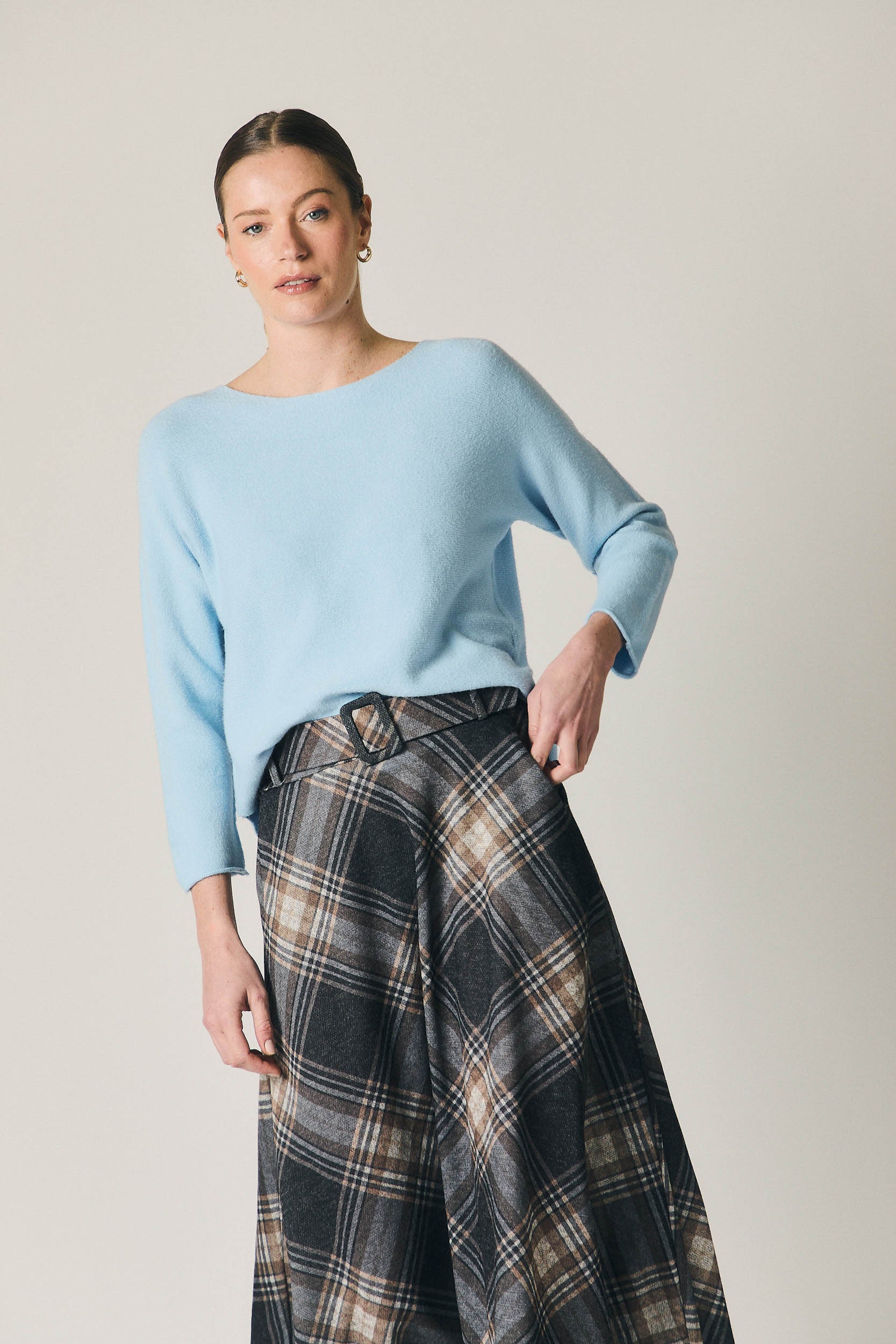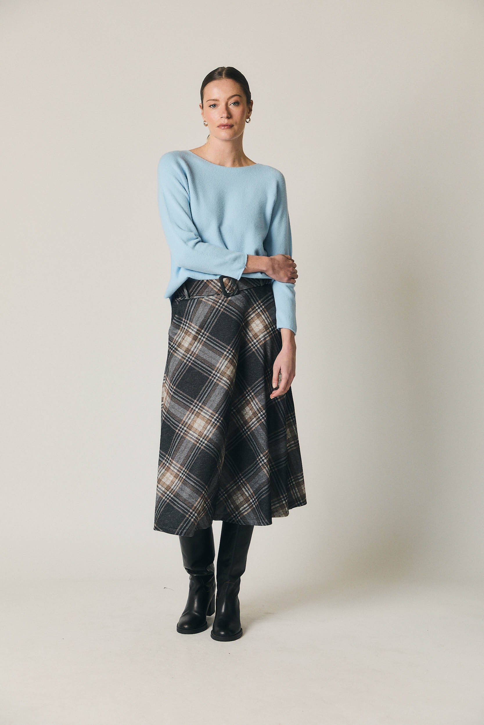 Ideal para coordenar com uma camisola de malha macia ou uma camisa lisa, adapta-se com elegância tanto ao trabalho como a um jantar descontraído. Combine esta saia de xadrez com botas altas ou botins para um look de inspiração retro, confortável em camadas e com um toque sofisticado, pronto para a cidade.