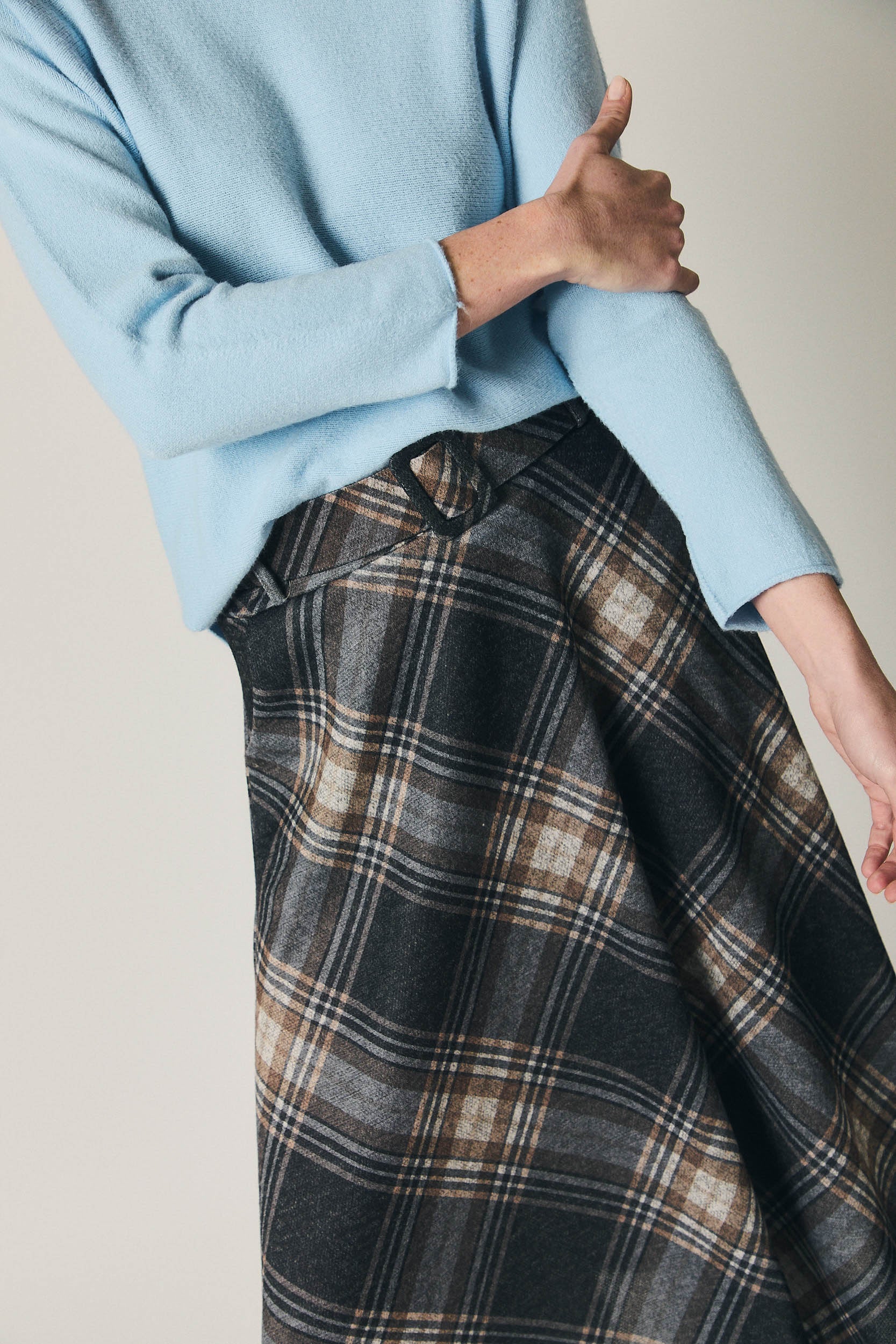 A saia midi de xadrez cinzento destaca-se pelo corte evasé com movimento subtil e cintura alta com presilhas, que alonga e afina a silhueta. O padrão de quadros em tons de cinzento e bege, aliado ao tecido com corpo e boa queda, cria uma peça estruturada mas fluida, perfeita para os dias mais frios.