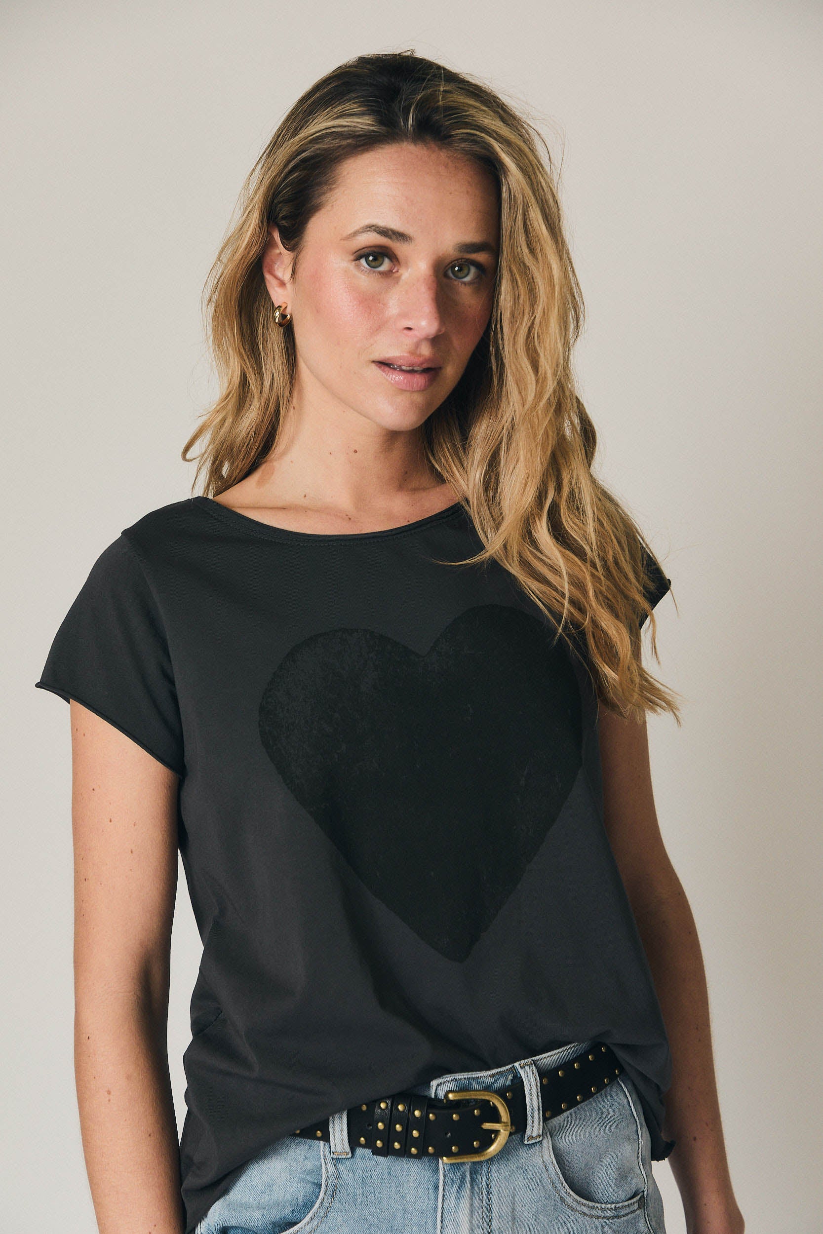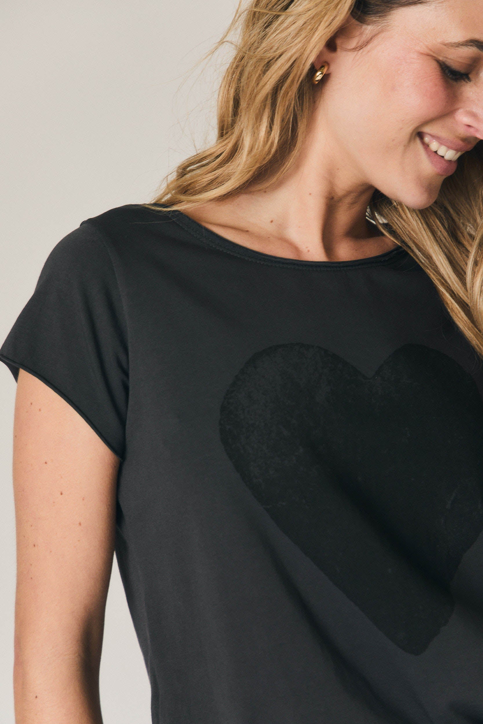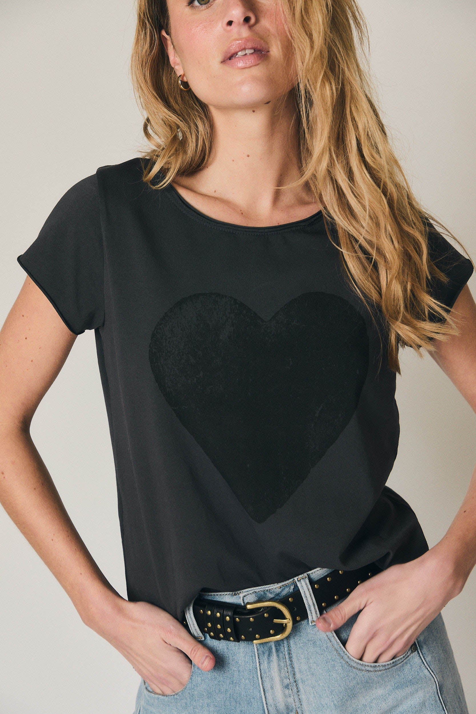 A t-shirt preta com coração em relevo discreto destaca-se pelo corte direito e escote redondo clássico, criando uma linha limpa e favorecedora. As mangas ligeiramente descaídas suavizam os ombros e garantem conforto, enquanto o estampado tom sobre tom acrescenta um detalhe elegante sem excessos. O comprimento ao nível da anca permite usá-la solta ou por dentro de calças e saias, mantendo sempre uma silhueta equilibrada.
