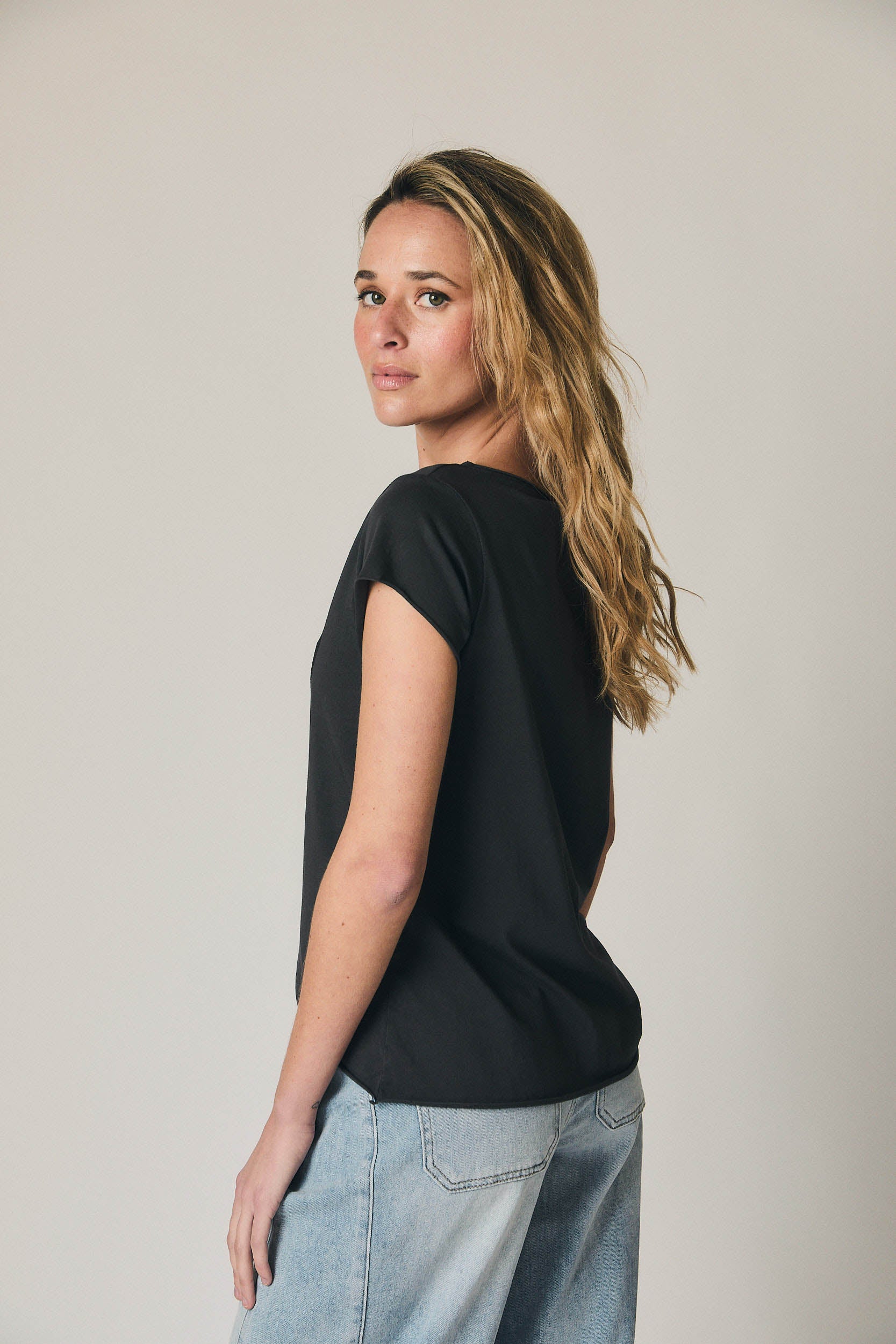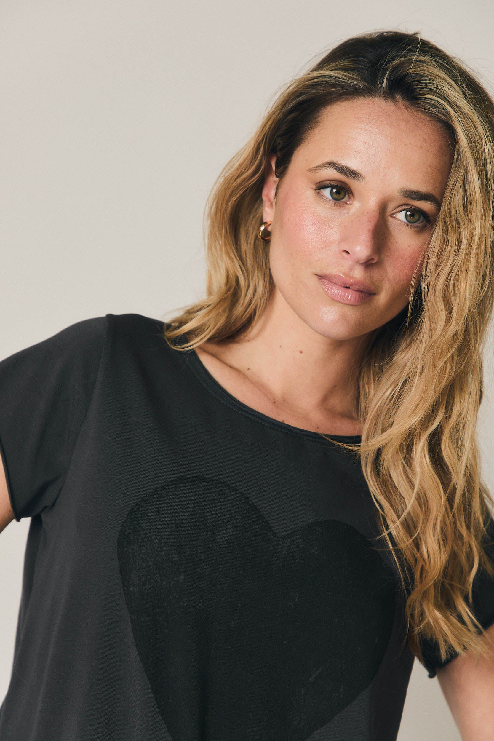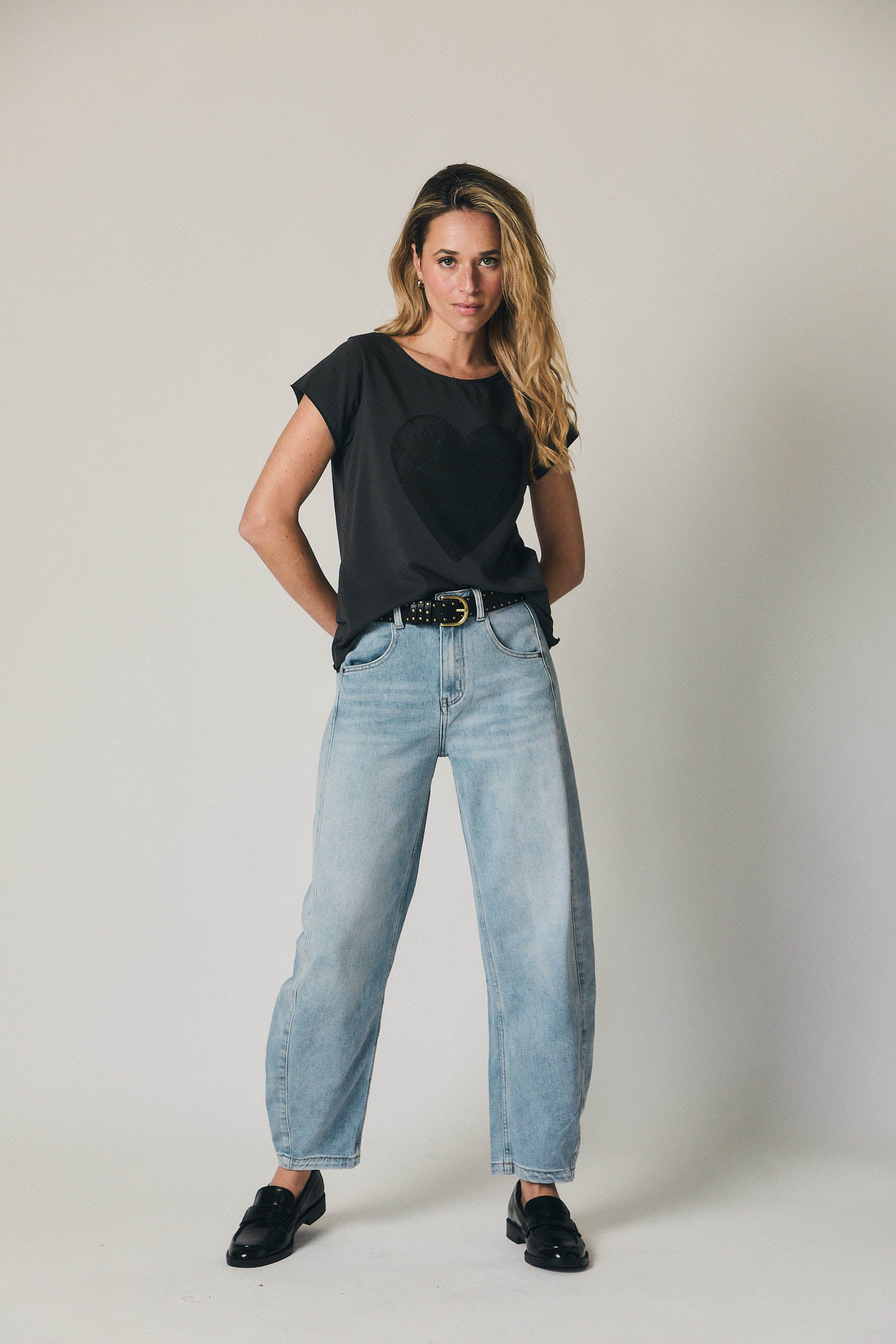 A t-shirt preta com coração em relevo discreto destaca-se pelo corte direito e escote redondo clássico, criando uma linha limpa e favorecedora. As mangas ligeiramente descaídas suavizam os ombros e garantem conforto, enquanto o estampado tom sobre tom acrescenta um detalhe elegante sem excessos. O comprimento ao nível da anca permite usá-la solta ou por dentro de calças e saias, mantendo sempre uma silhueta equilibrada.
