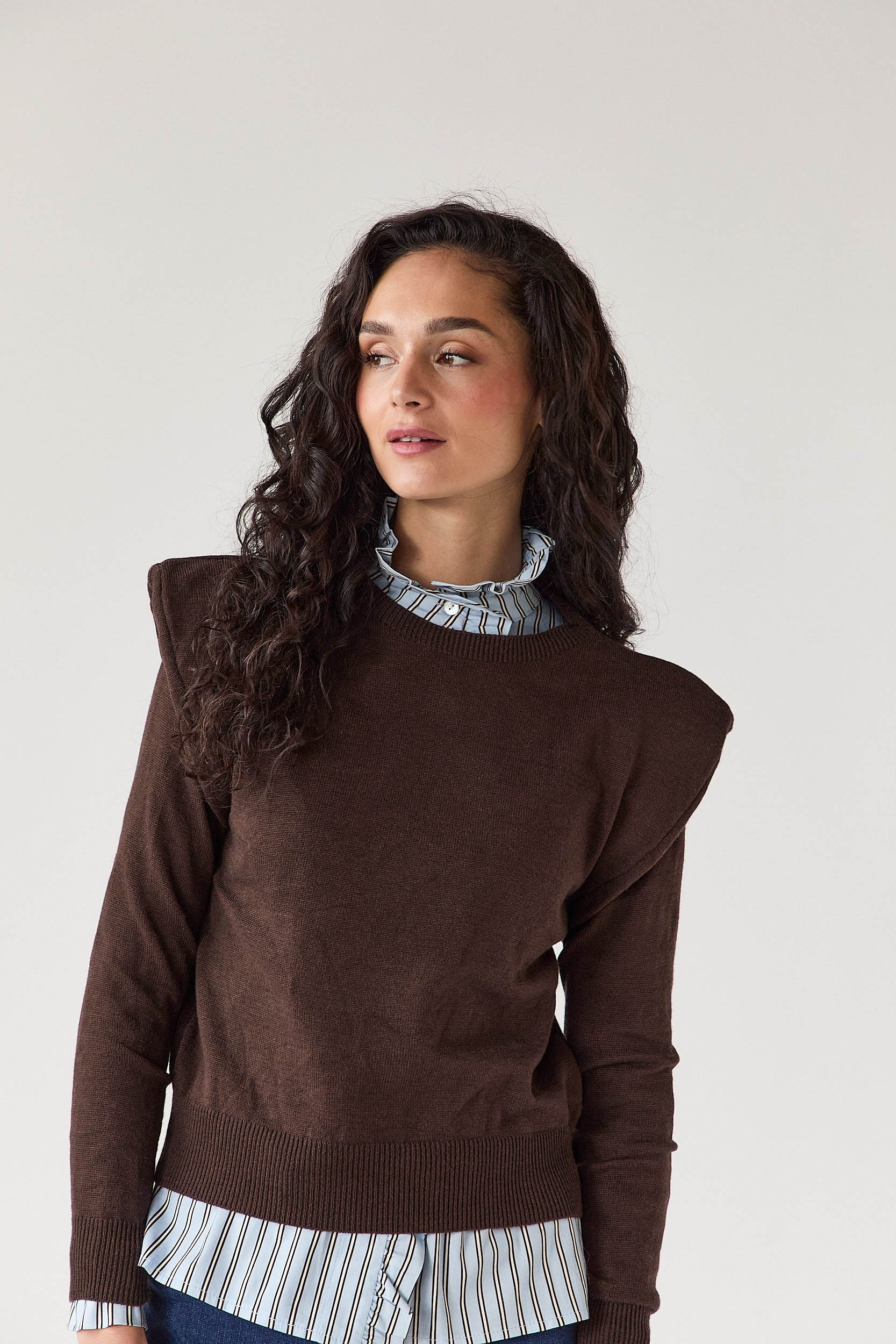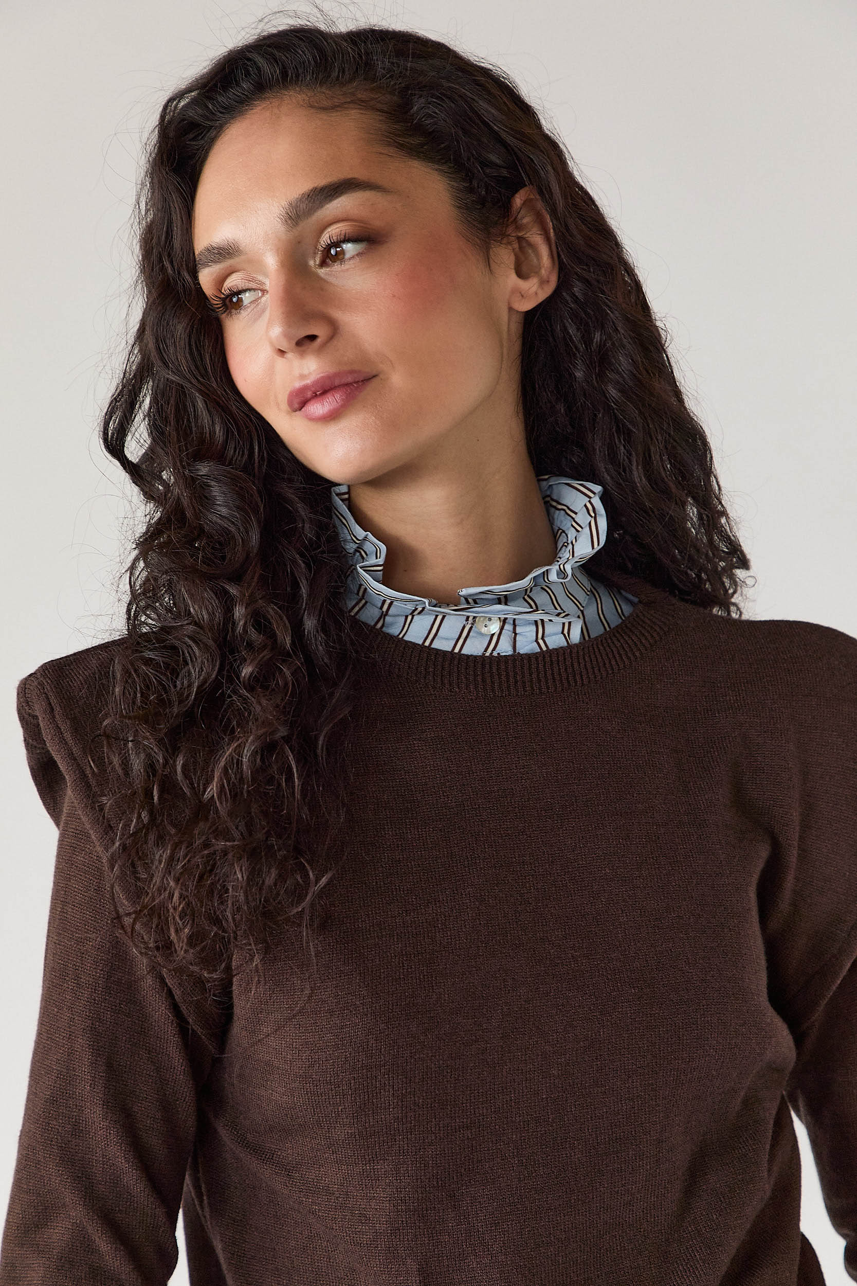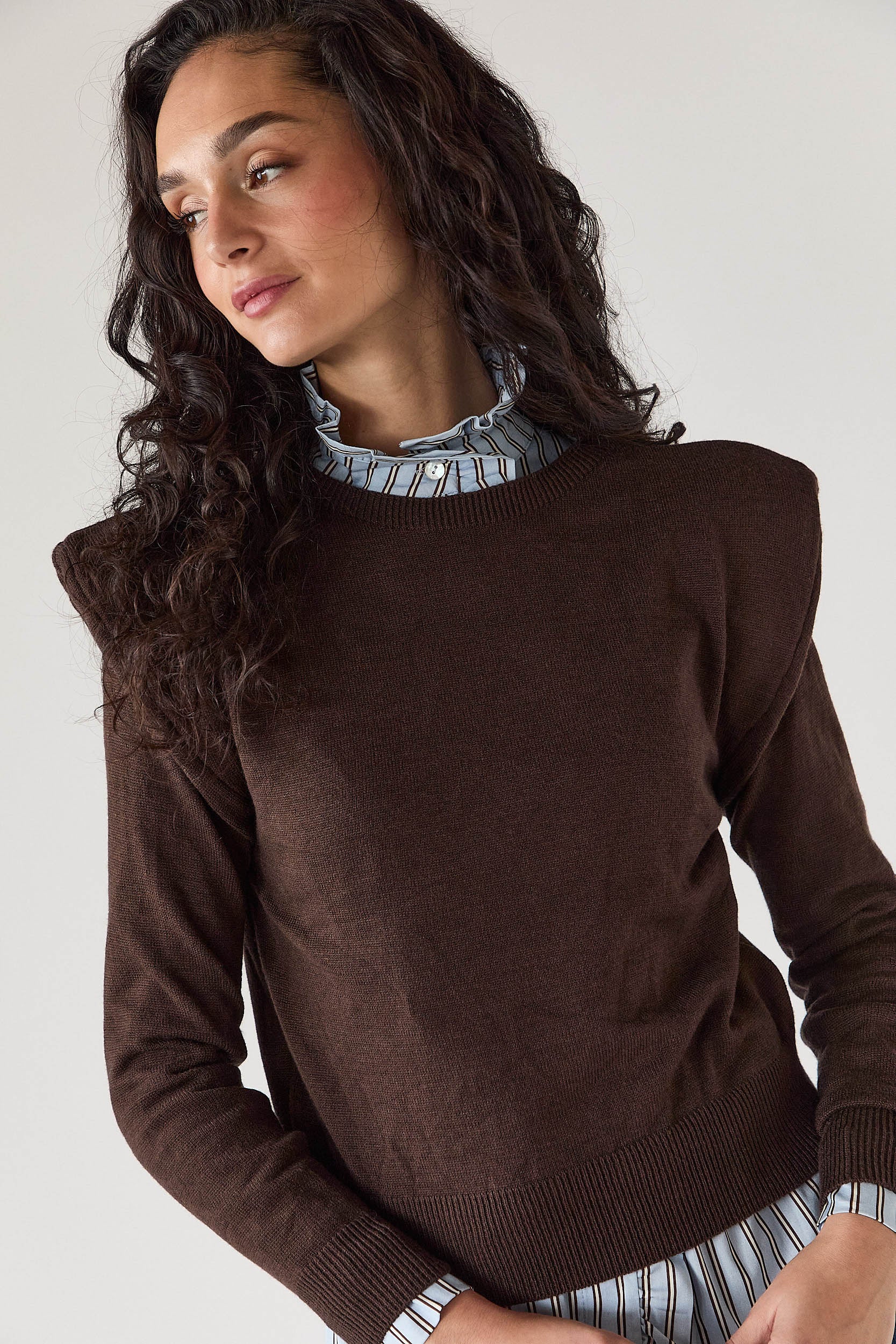 Jersey de punto en tono marrón chocolate, con corte recto y silueta estructurada. Presenta cuello redondo, manga larga y hombreras integradas que definen la línea de los hombros sin perder naturalidad. Los acabados acanalados en cuello, puños y bajo aportan ajuste y equilibrio al diseño.