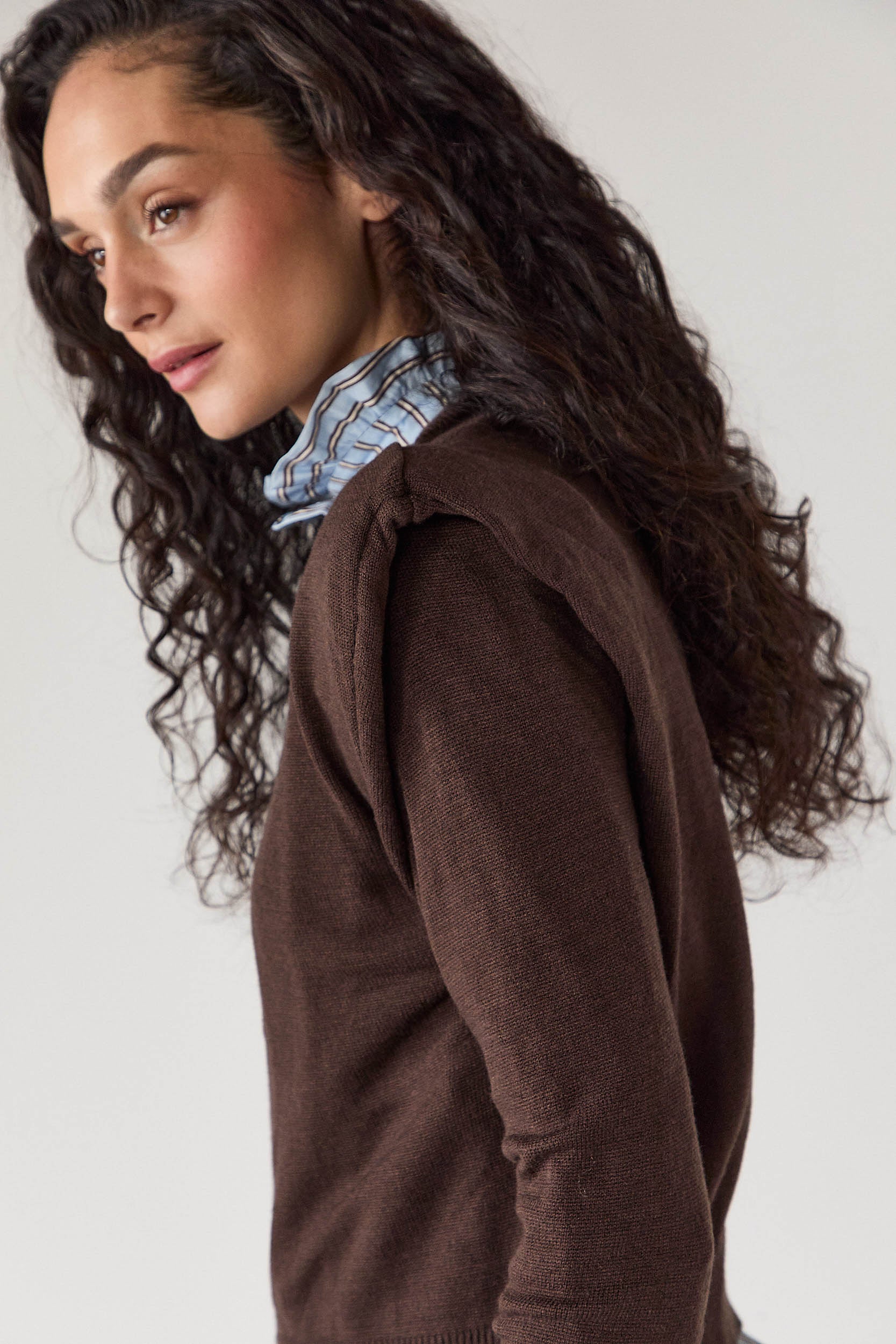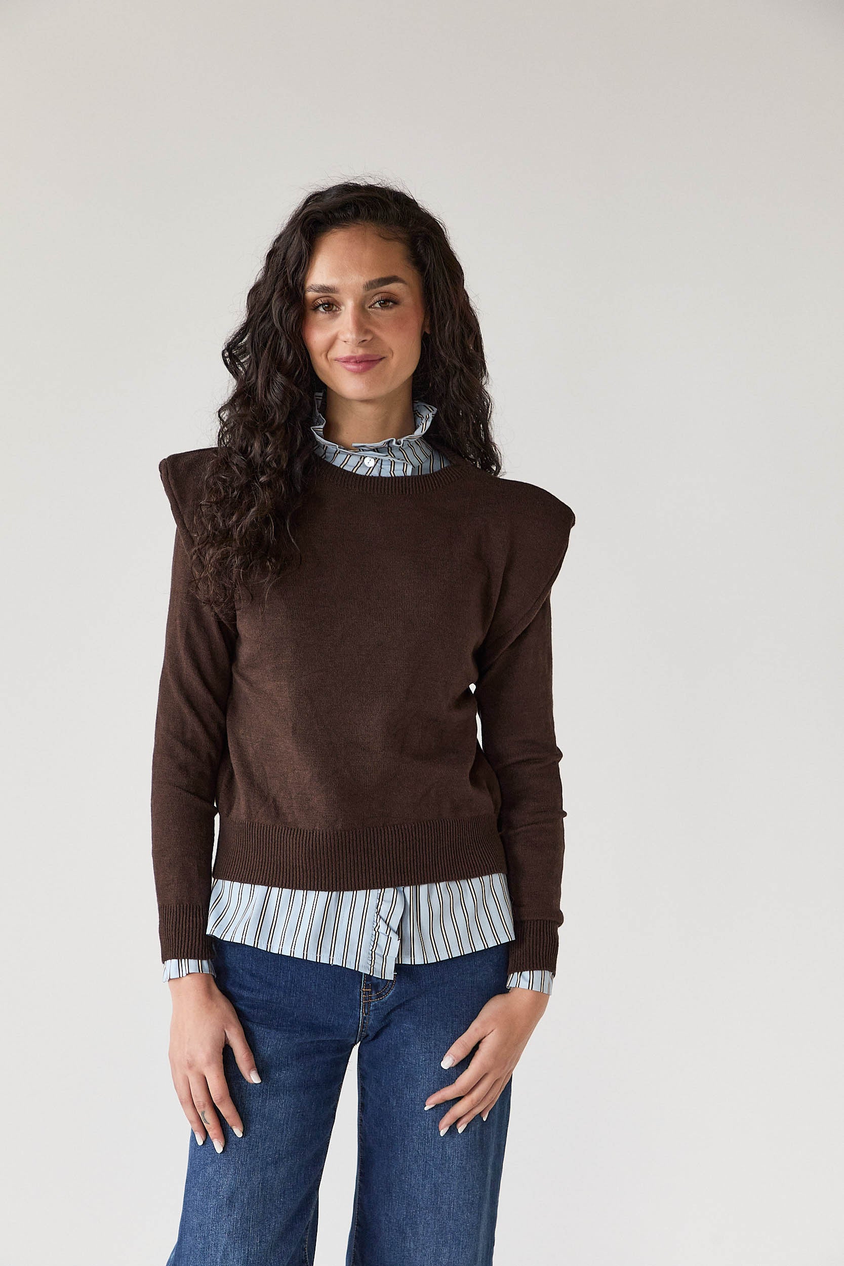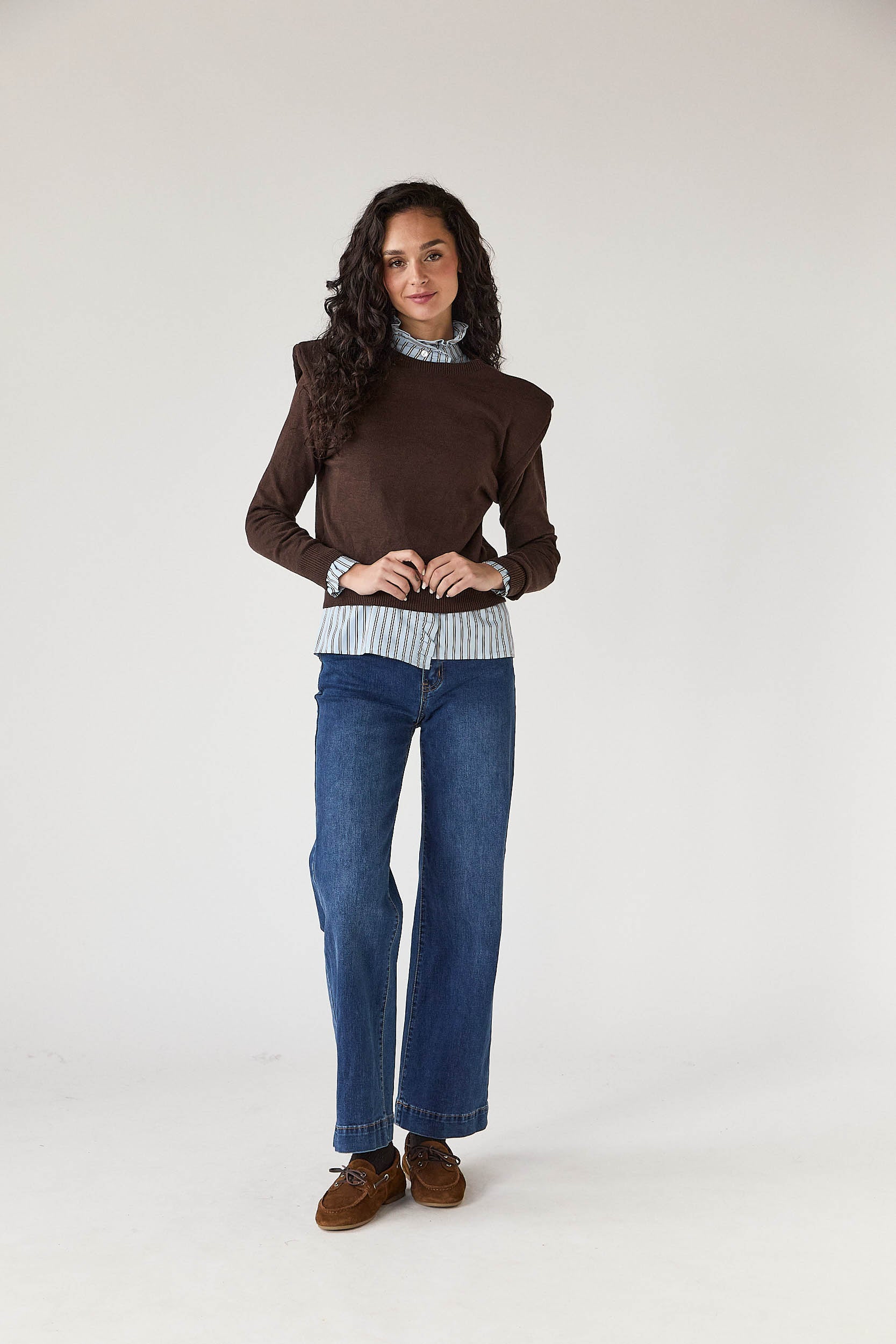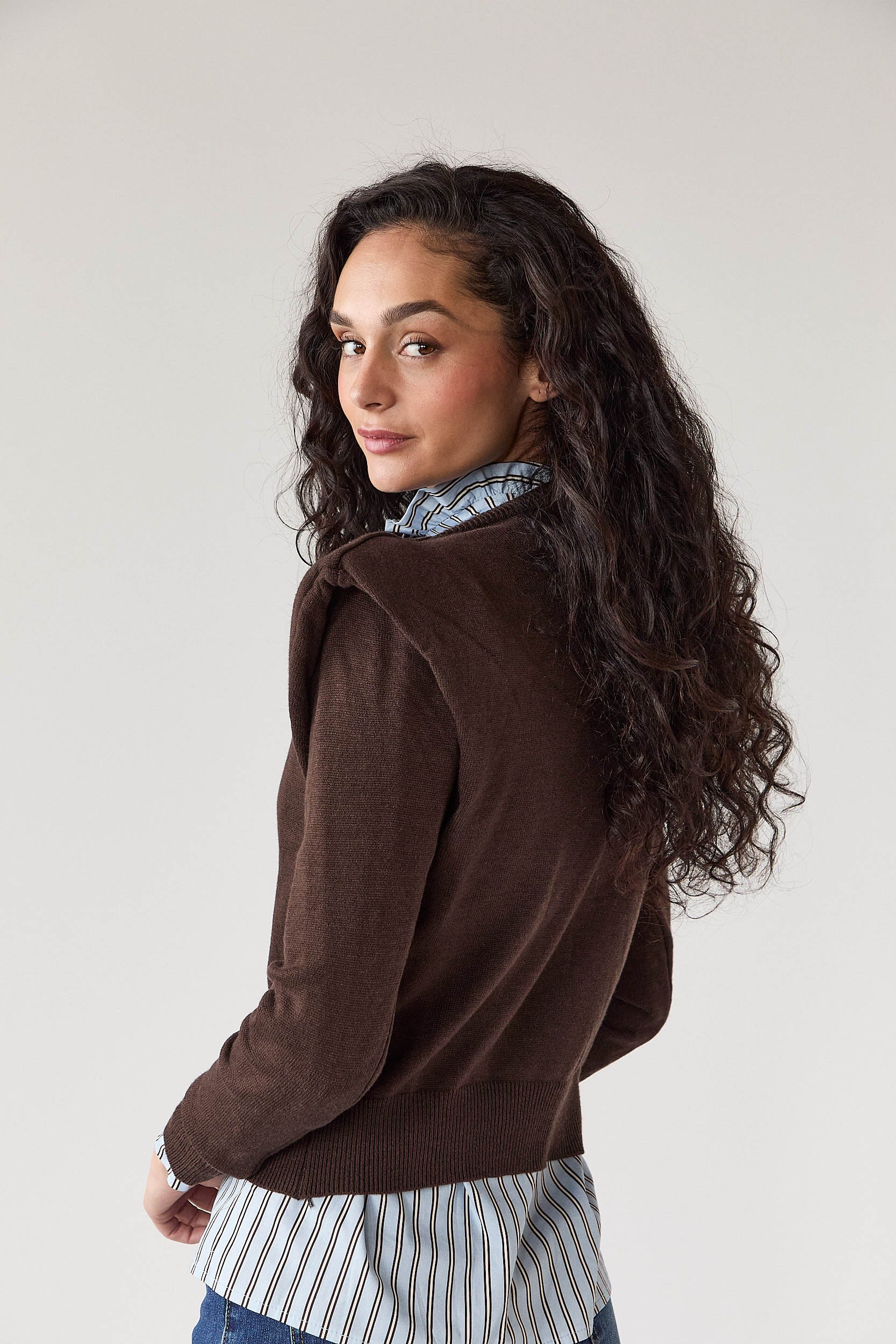 Jersey de punto en tono marrón chocolate, con corte recto y silueta estructurada. Presenta cuello redondo, manga larga y hombreras integradas que definen la línea de los hombros sin perder naturalidad. Los acabados acanalados en cuello, puños y bajo aportan ajuste y equilibrio al diseño.