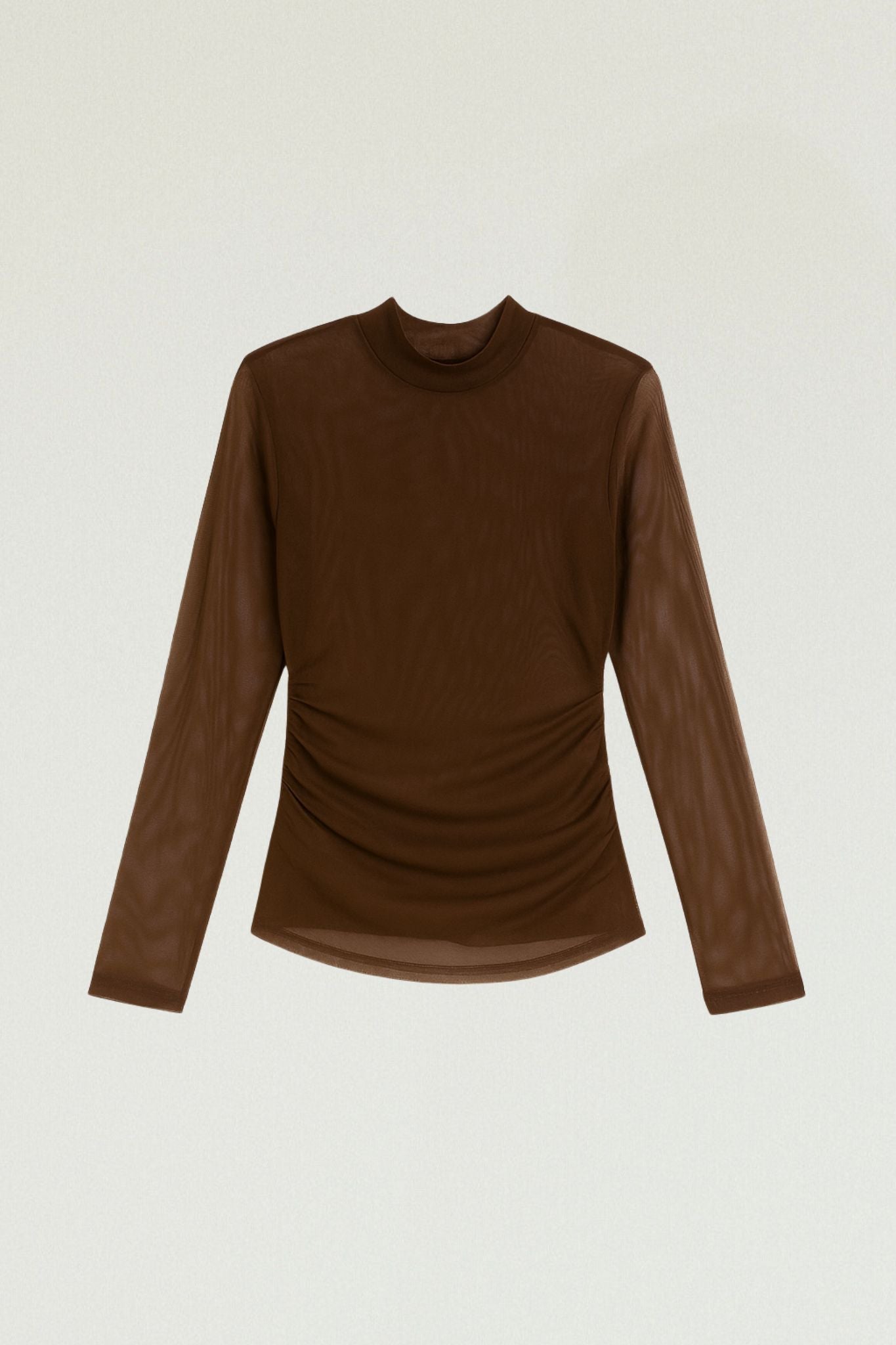 O top de tule castanho destaca-se pelo seu corte sem mangas, decote redondo e delicados franzidos laterais que realçam a silhueta de forma subtil. O tecido leve e semitransparente confere um toque sofisticado e feminino, tornando este top uma peça versátil para qualquer guarda-roupa de senhora.