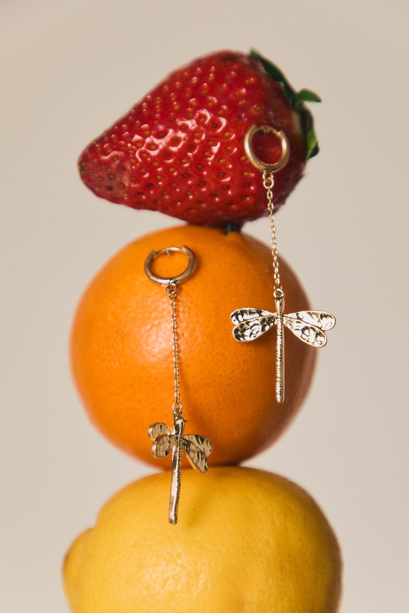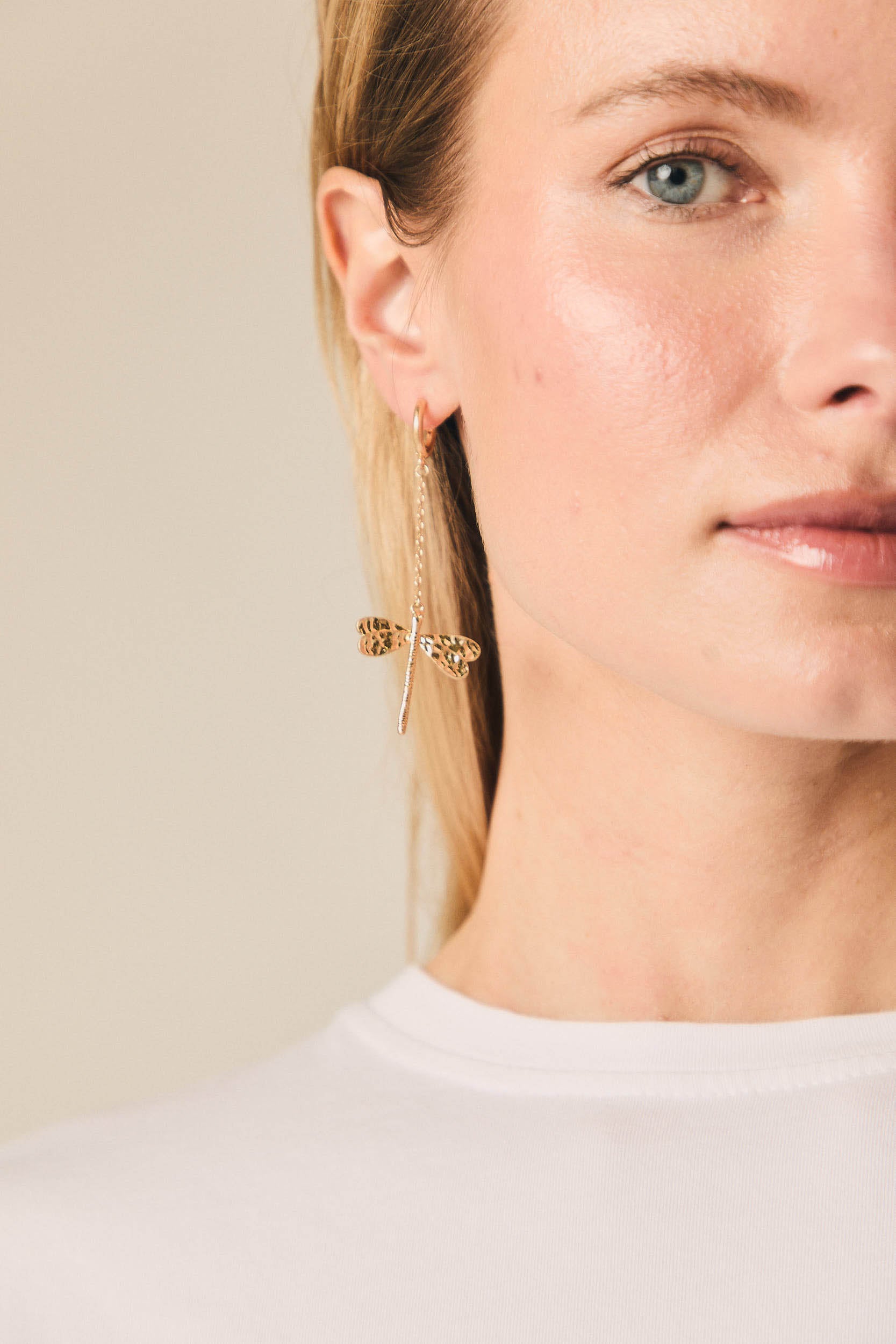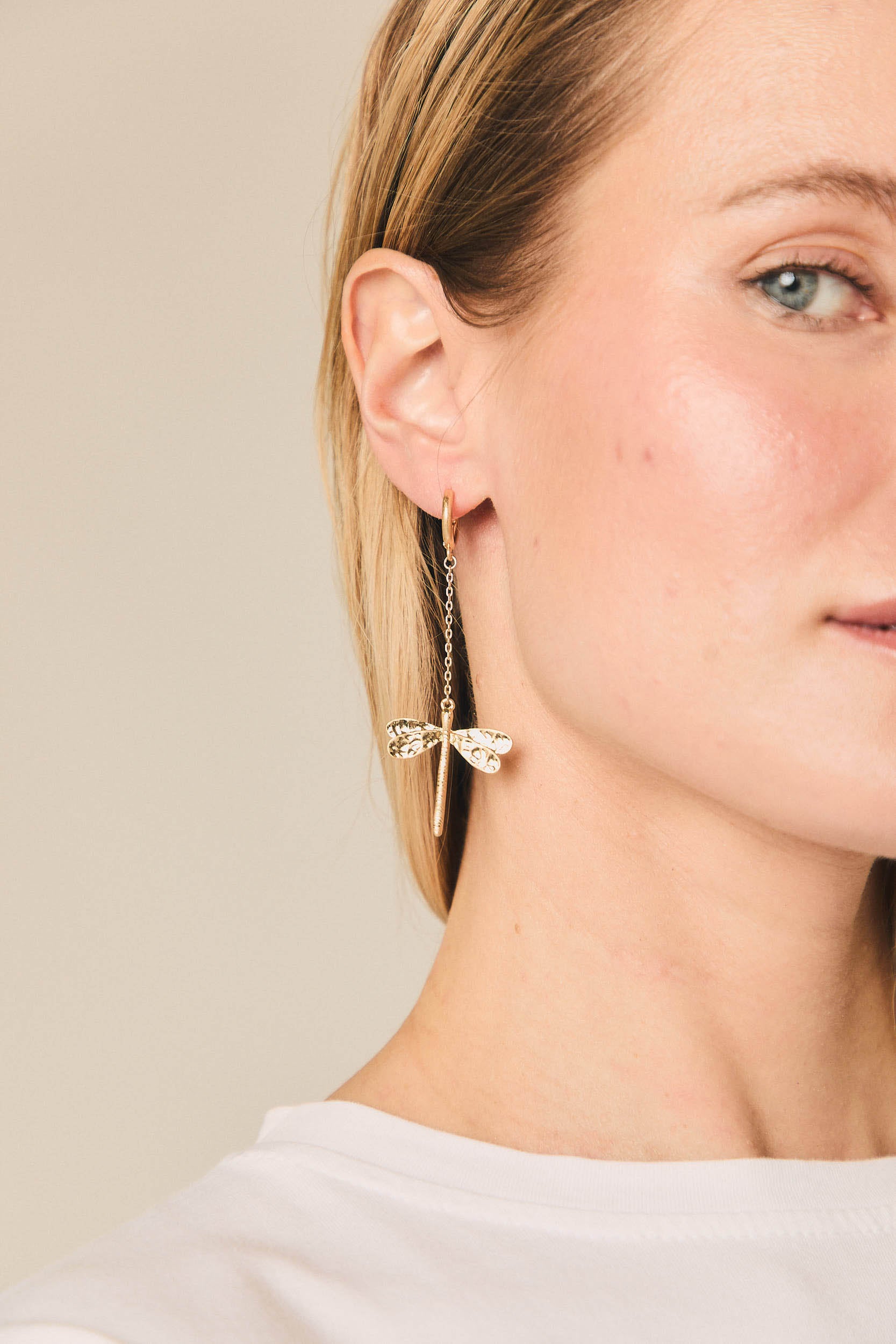 - Brincos em forma de libélula em tom dourado