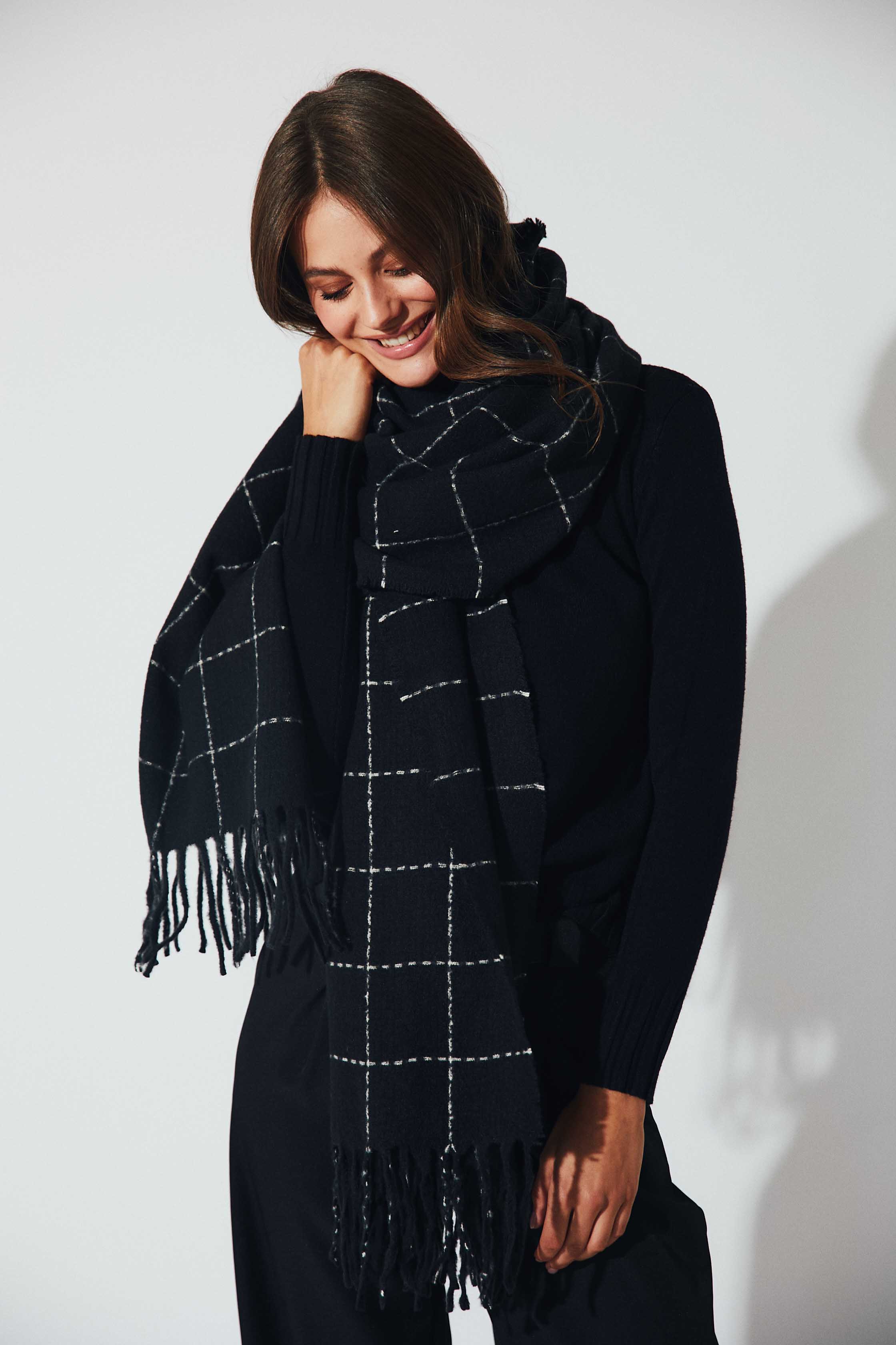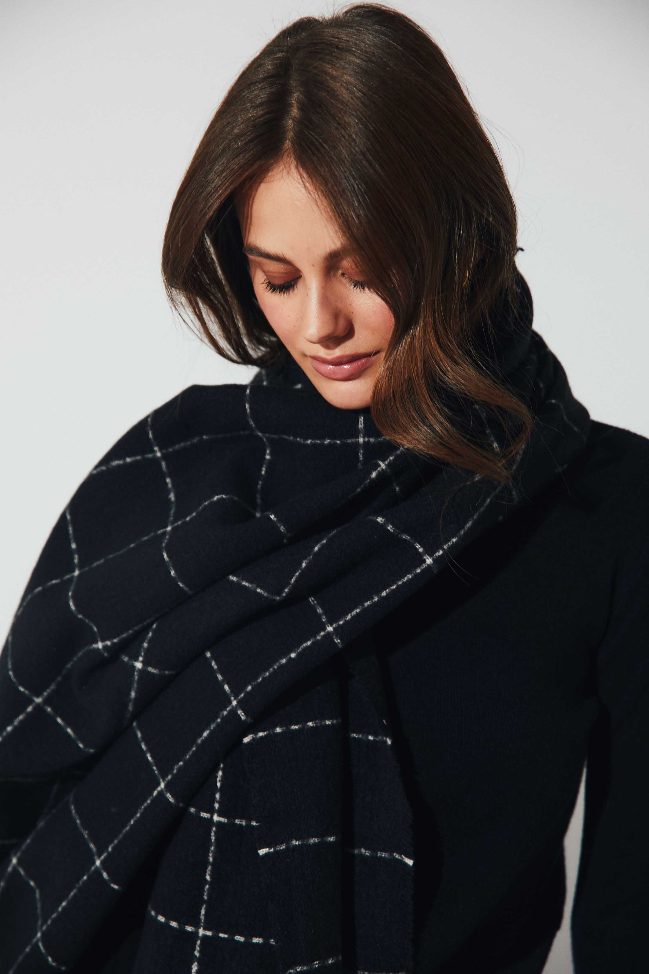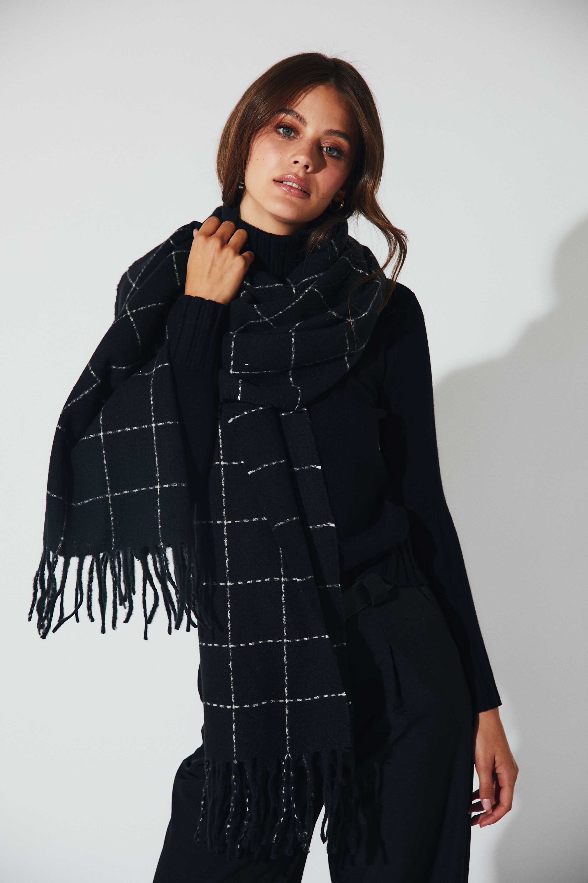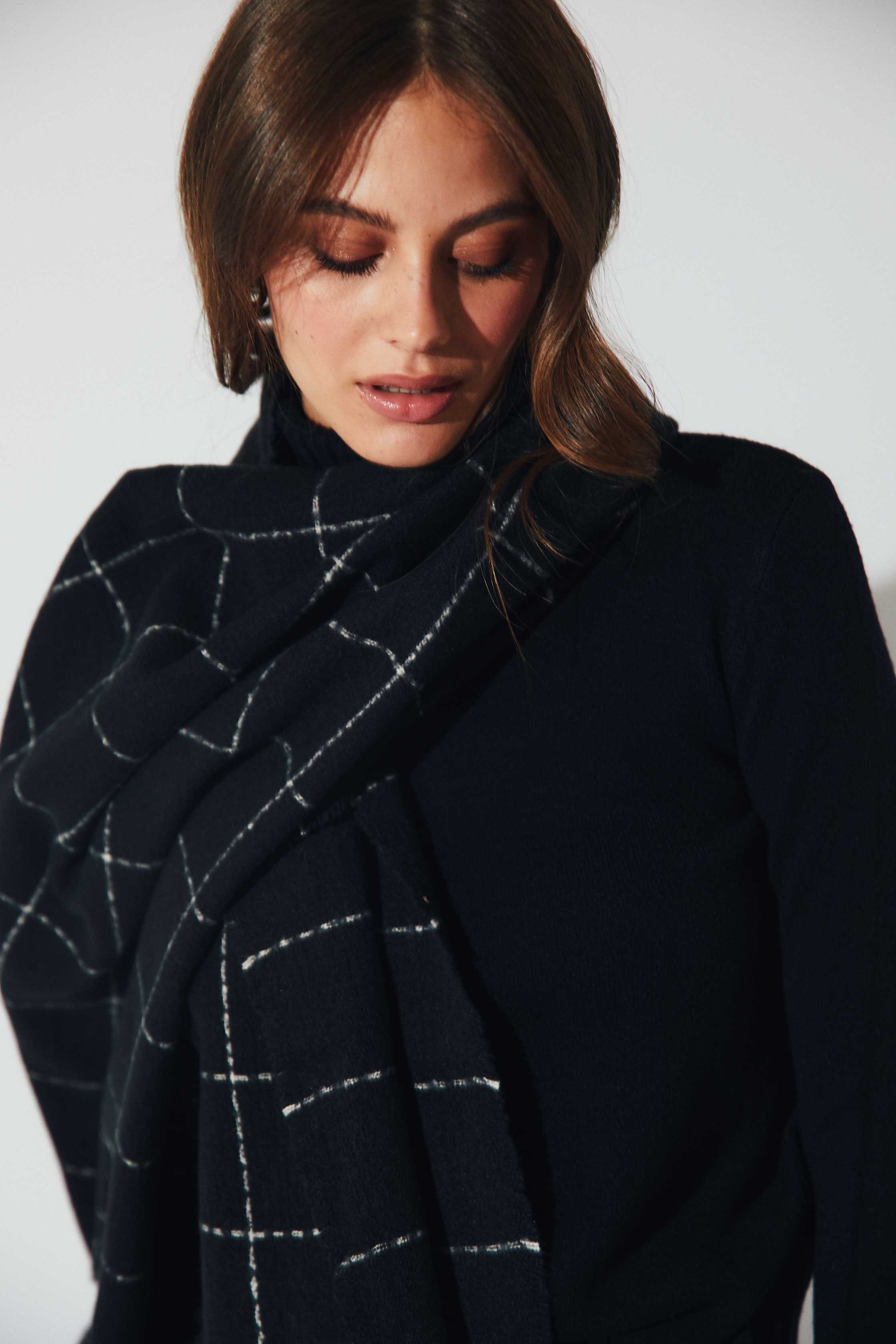 Bufanda negra con diseño de cuadros en tono crudo, de líneas finas y regulares que aportan un acabado limpio y moderno. El formato es amplio y envolvente, perfecto para crear volumen alrededor del cuello o llevarla con caída más recta. Los flecos largos en los extremos le dan un toque suave y dinámico.
