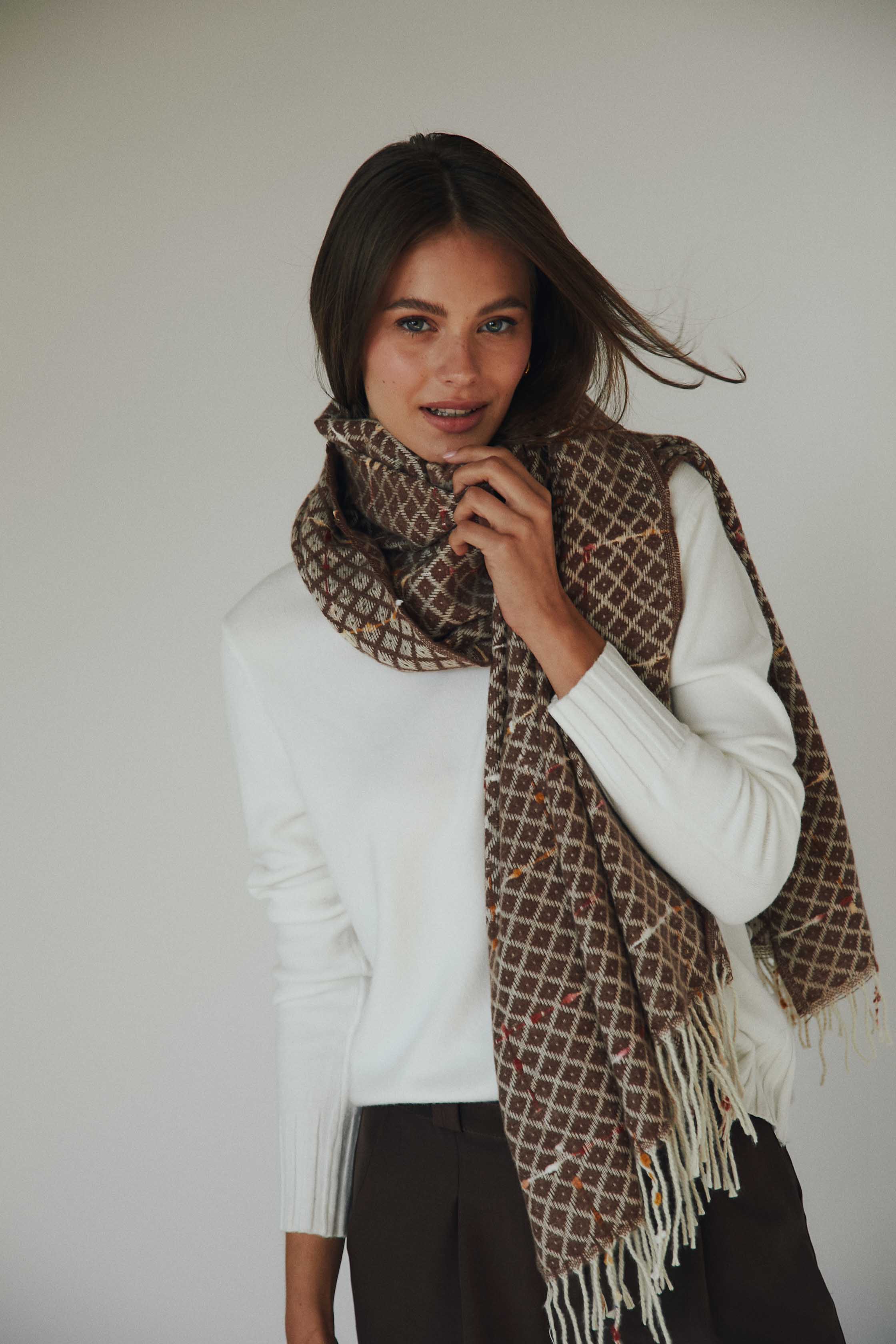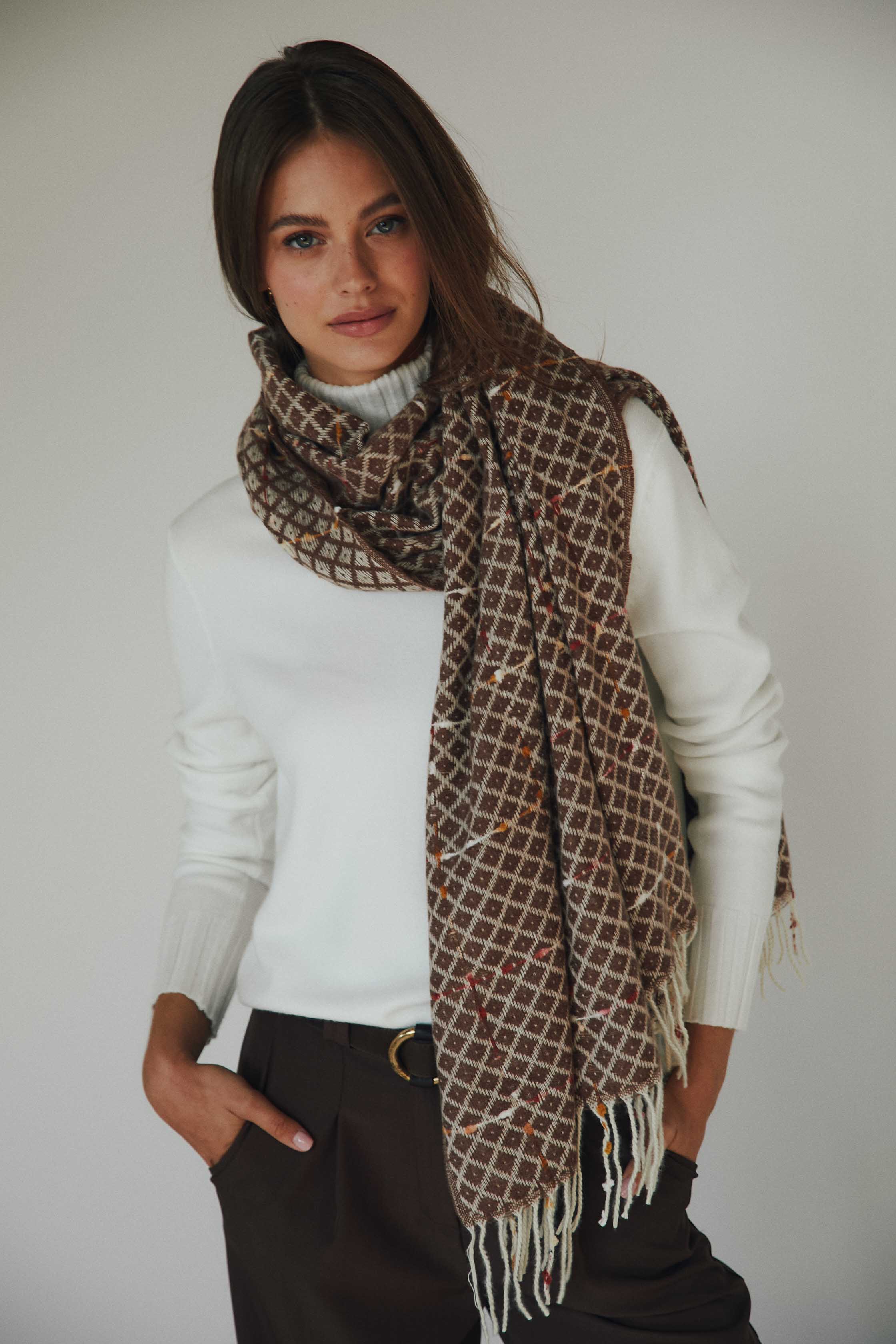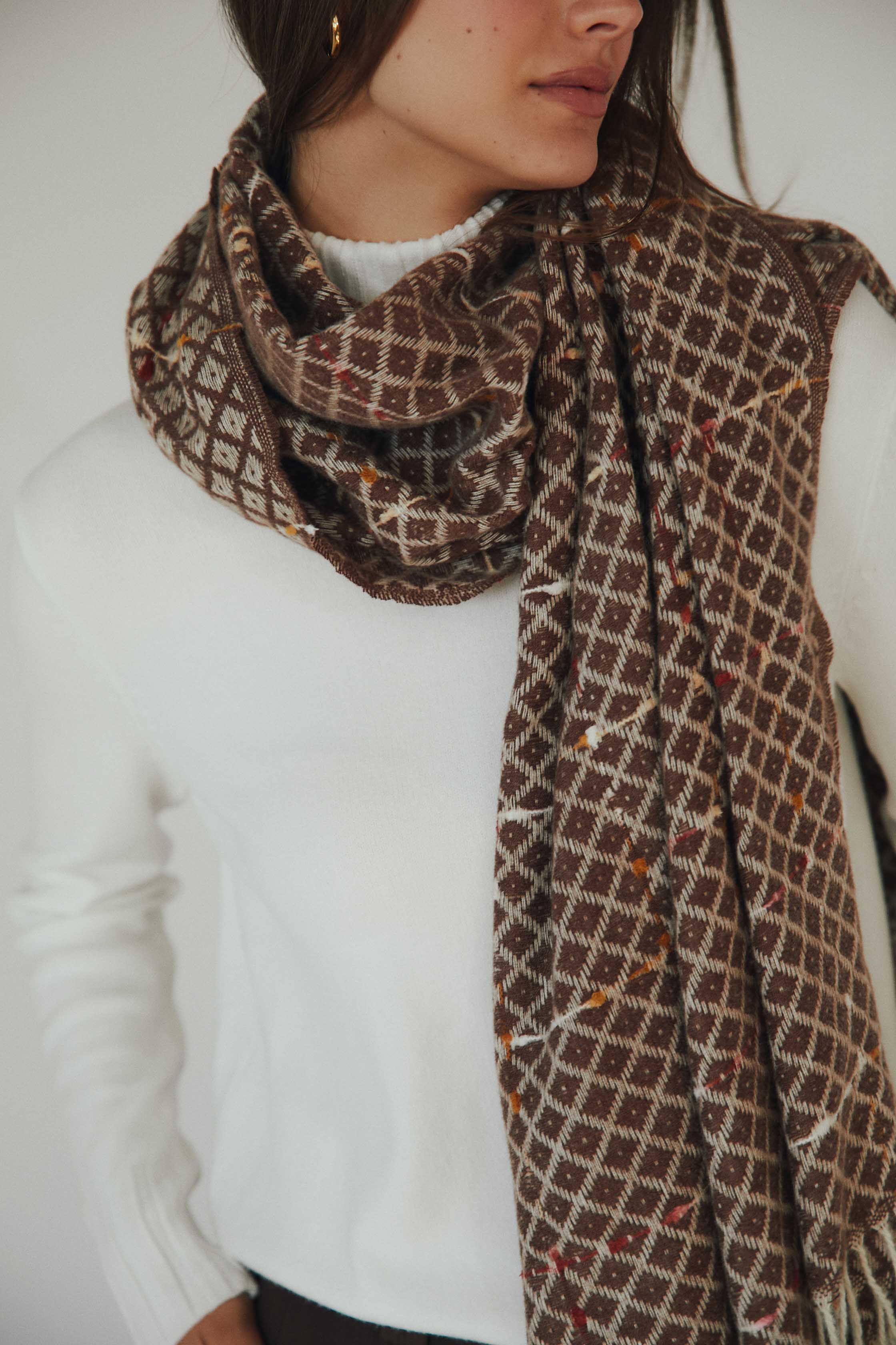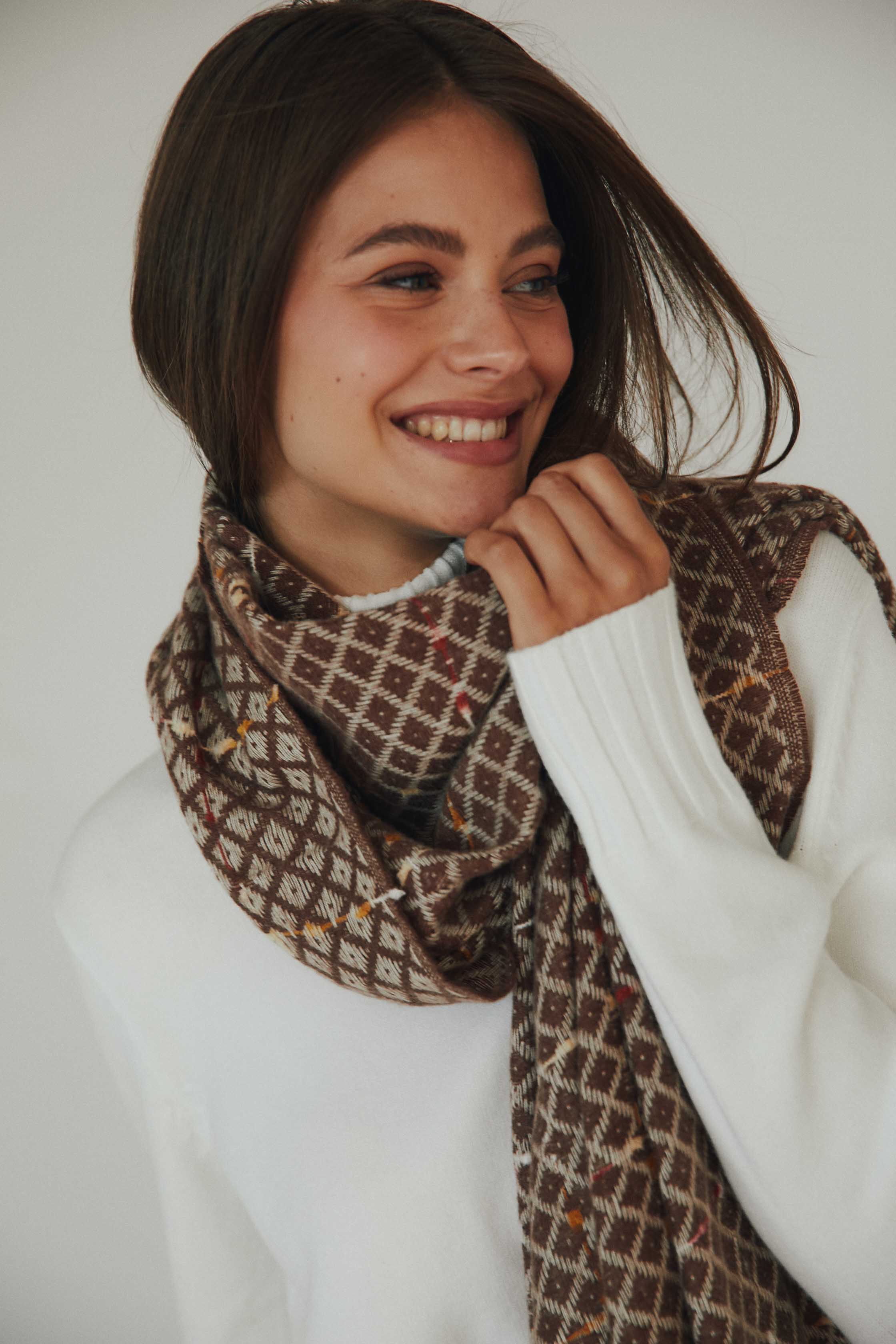 Bufanda de rombos en tonos marrones con detalle de pequeños toques de color que aportan textura visual. El diseño amplio permite llevarla al cuello con volumen o caída más recta, y los flecos largos en los extremos aportan un acabado suave y desenfadado.