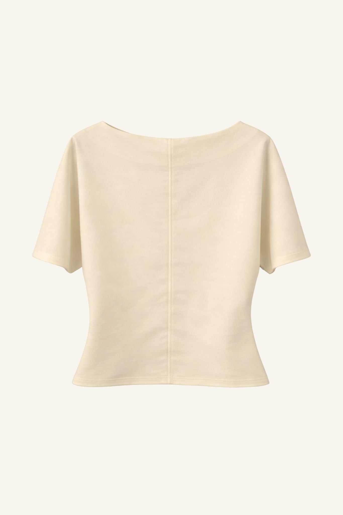 Top de mujer en color crema con corte ajustado y silueta entallada. Diseño de manga corta y escote barco que deja la línea de los hombros ligeramente a la vista. Largo a la cintura y acabado limpio en bajo y mangas, con costura central en la espalda que define la forma.