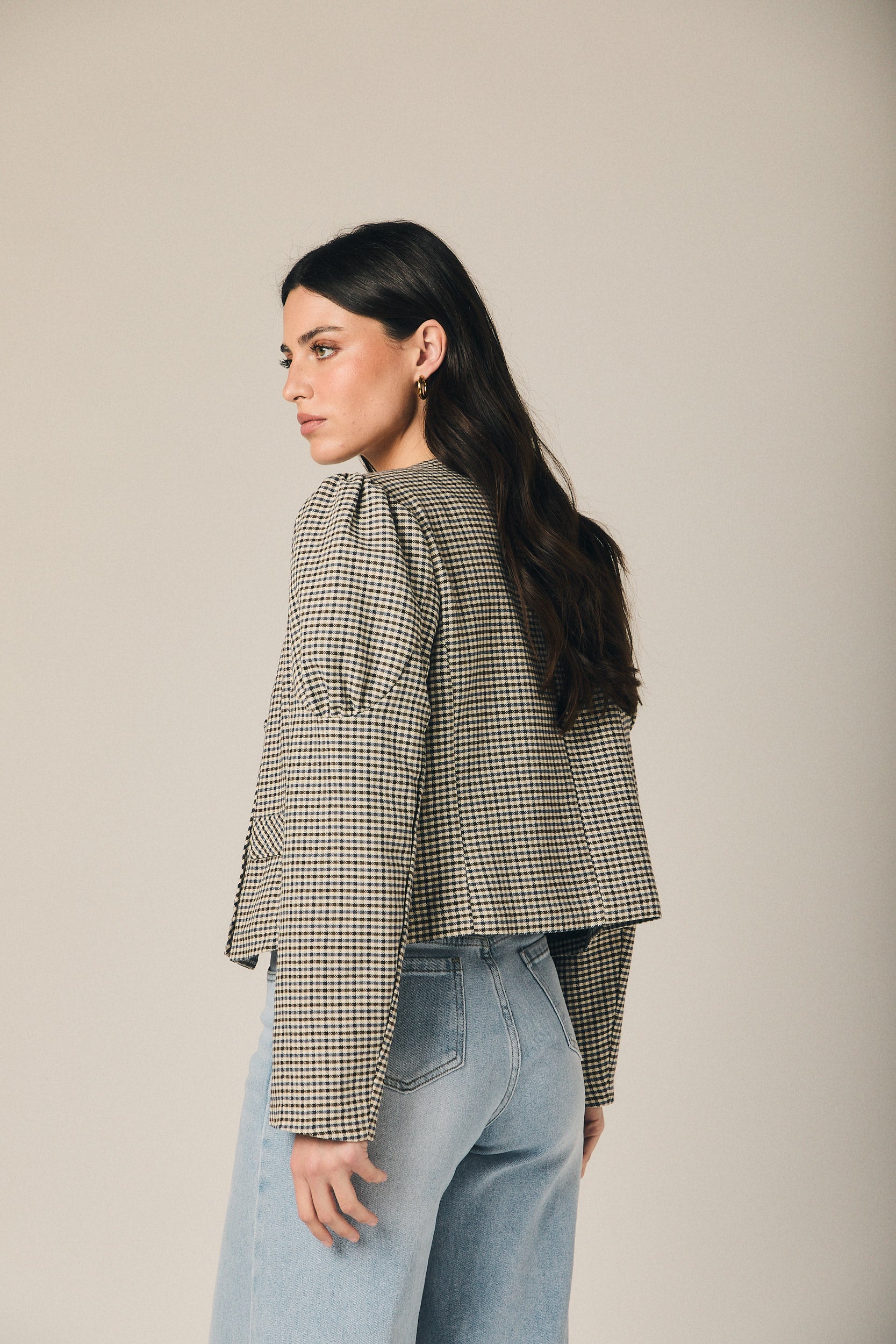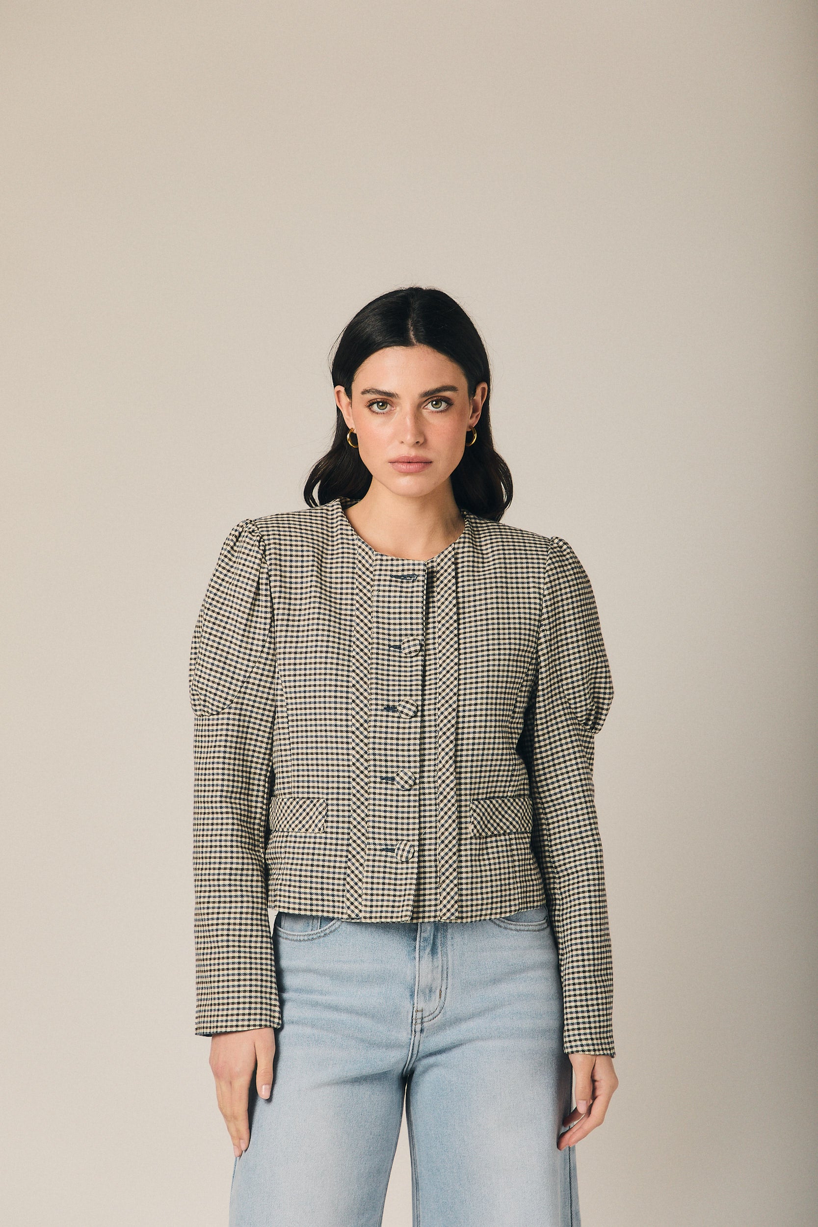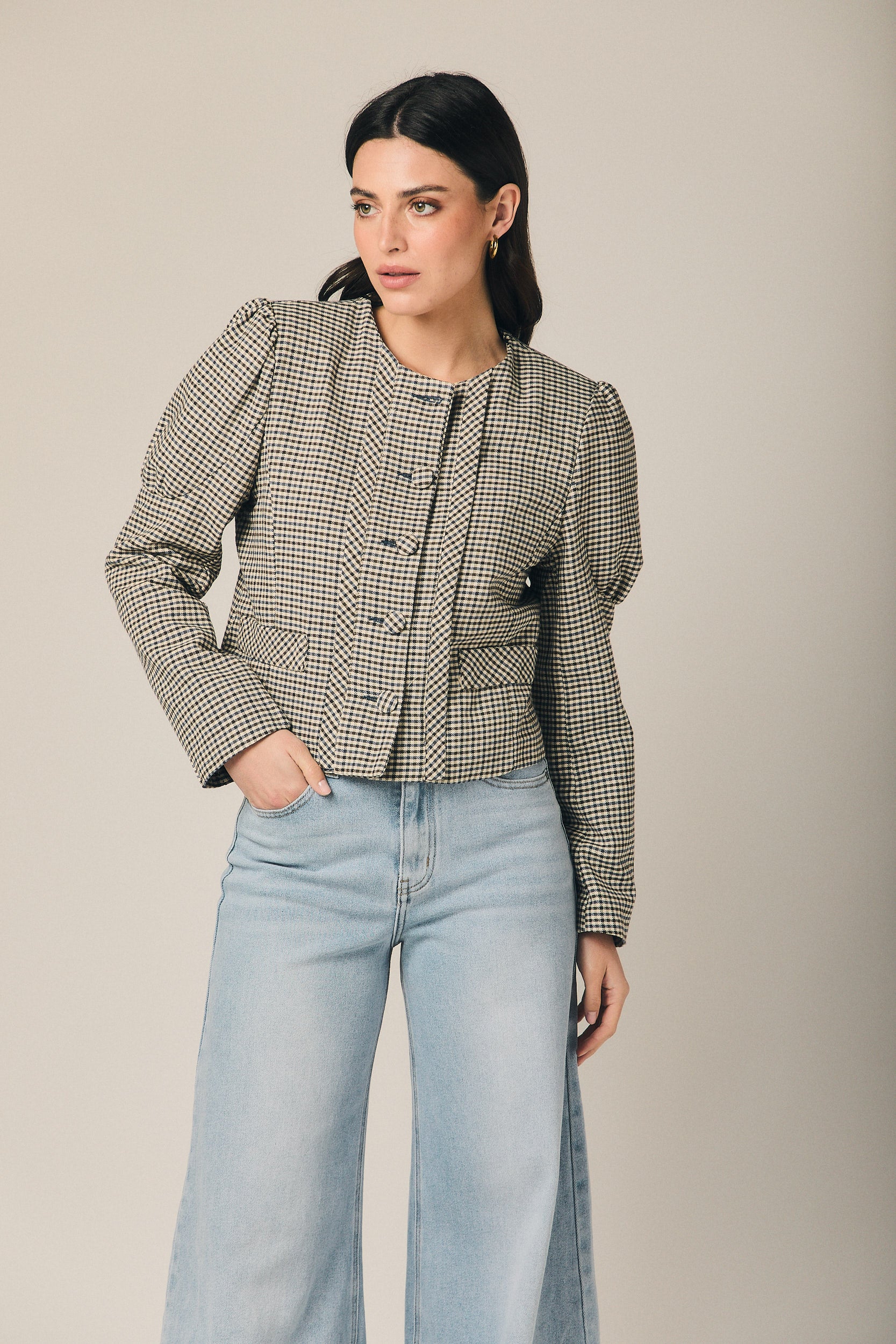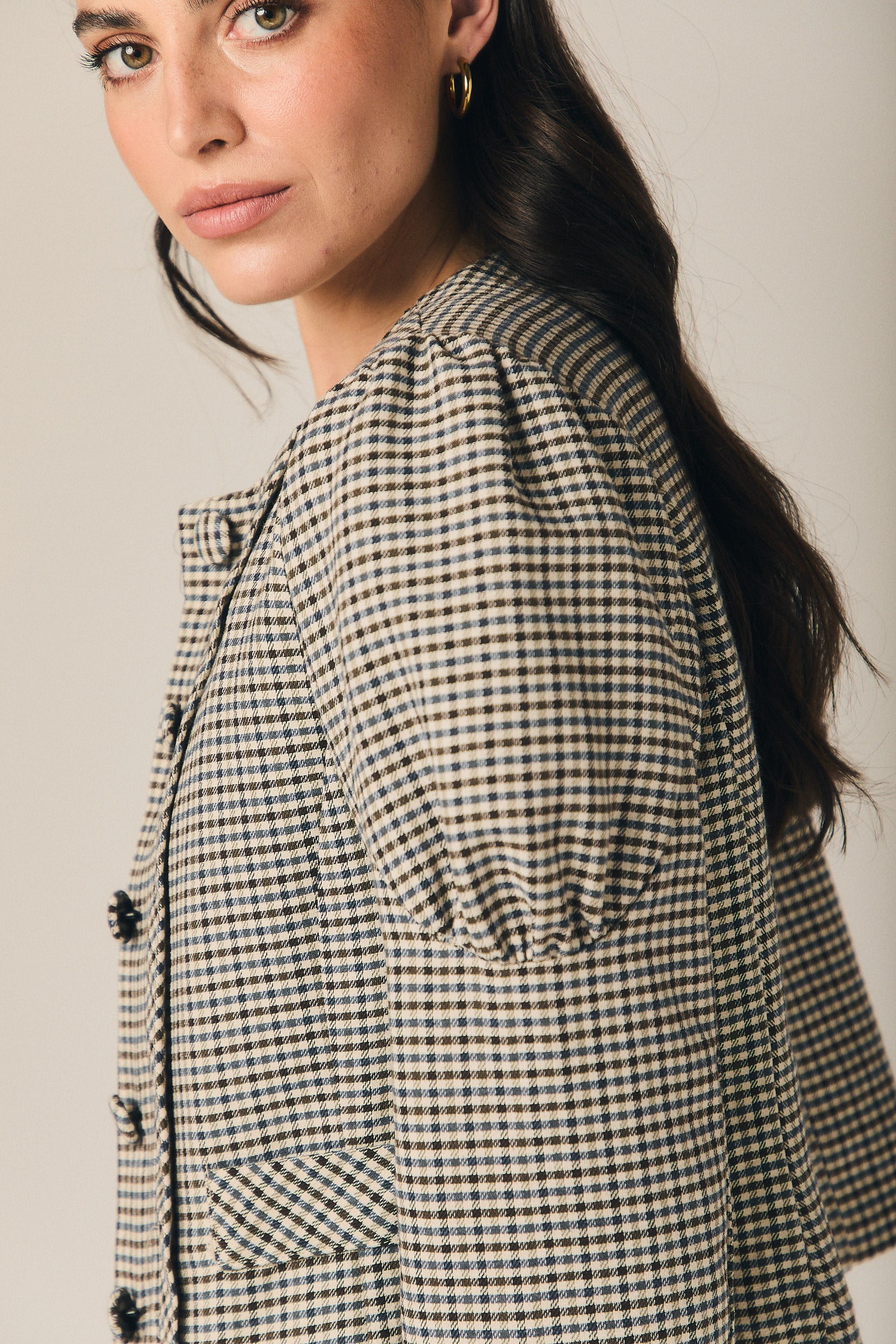 Casaco curto de quadrados em azul-marinho e cru, com corte estruturado e comprimento à cintura que define a silhueta sem pesar. O decote redondo enquadra o colo com sobriedade, enquanto o abotoamento frontal com botões visíveis e os bolsos de chapa funcionais reforçam o carácter de casaco de inspiração sastre. As mangas compridas apresentam um ligeiro volume no ombro, conferindo presença e um cair limpo sobre o corpo.