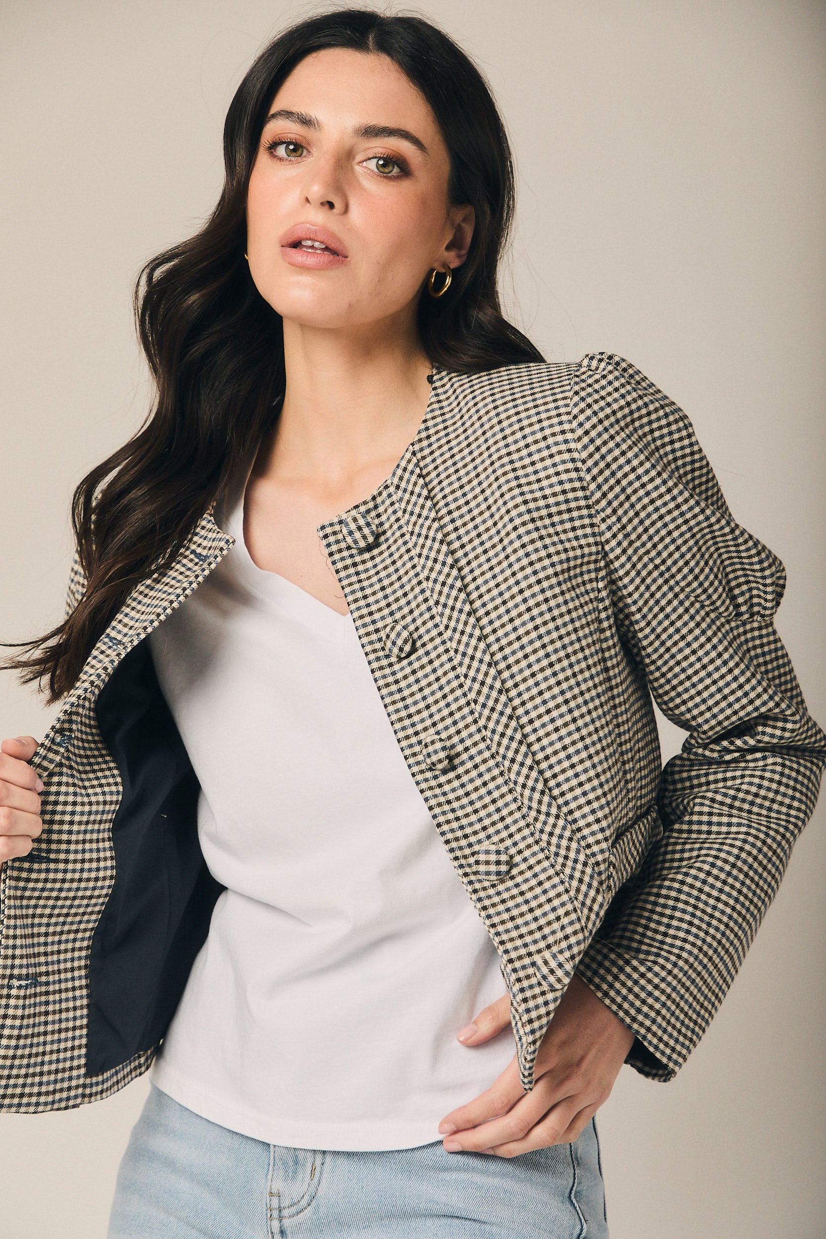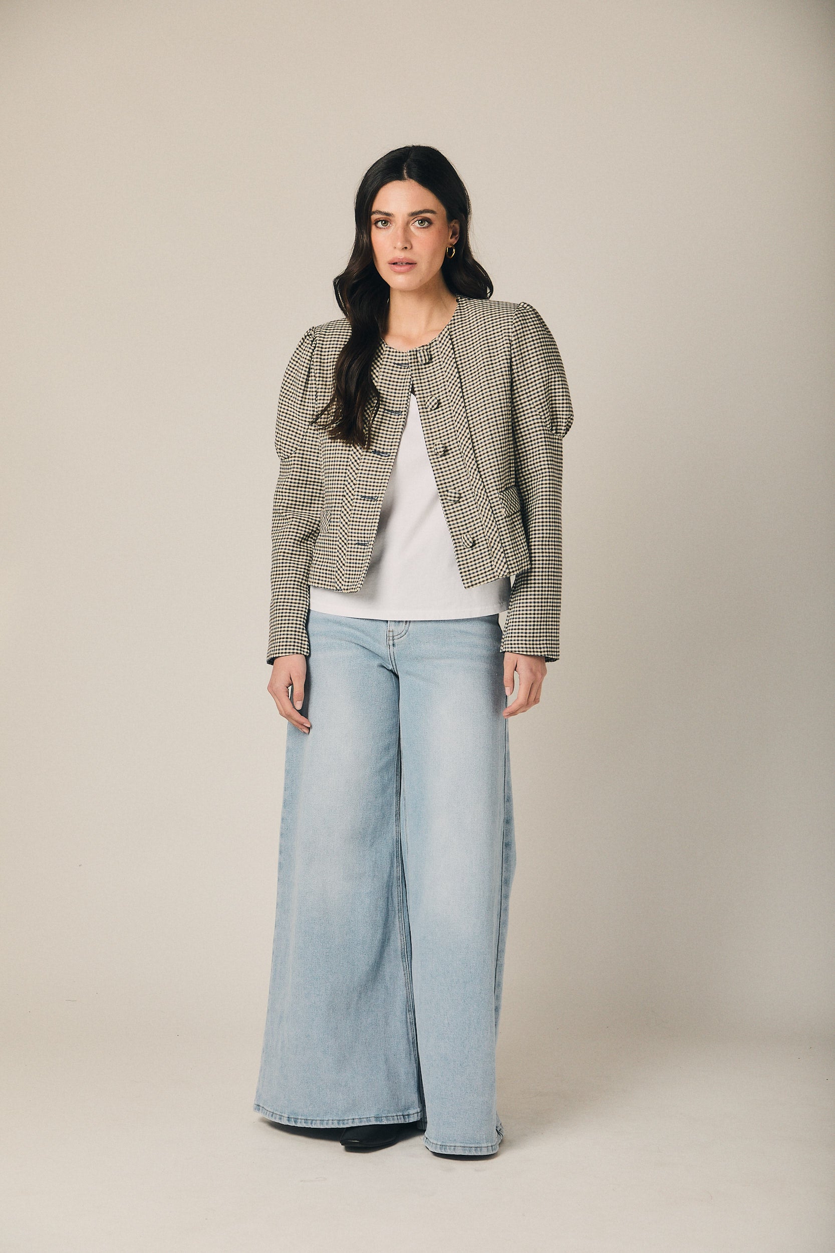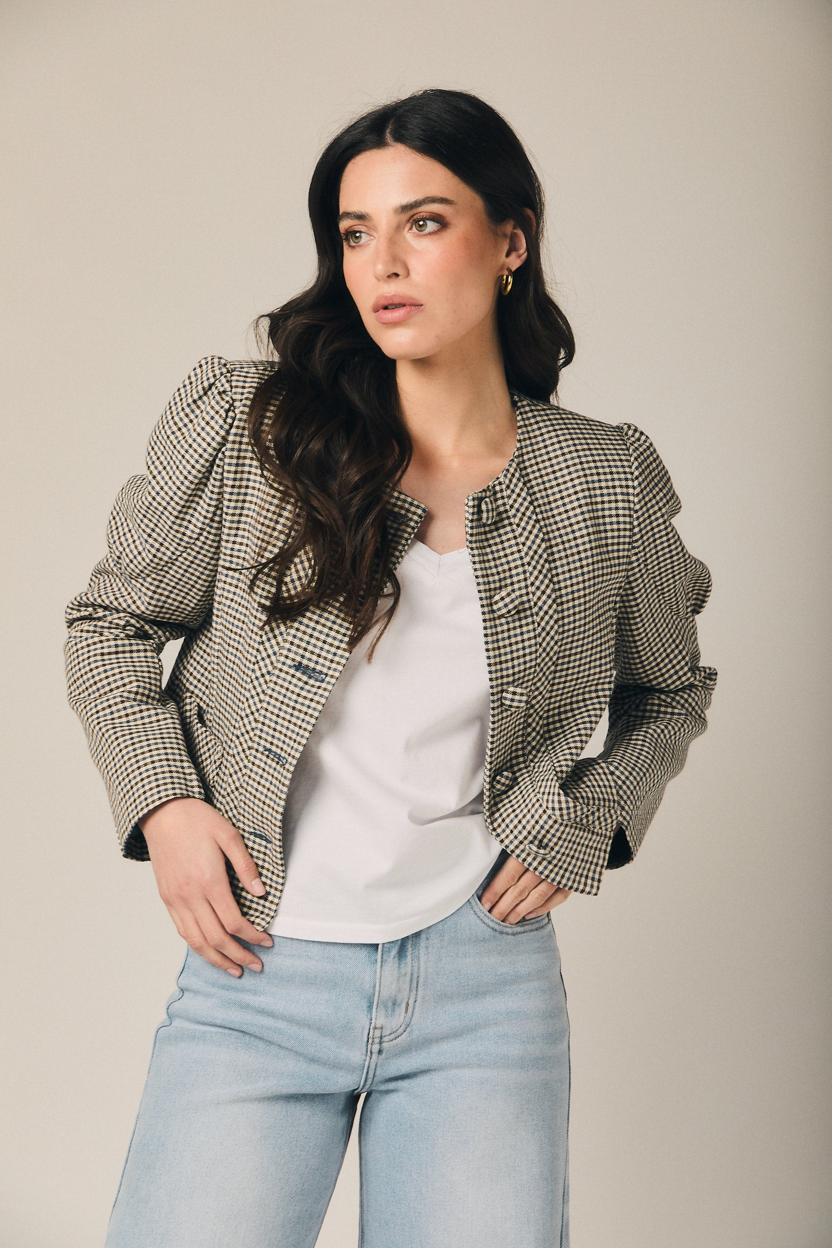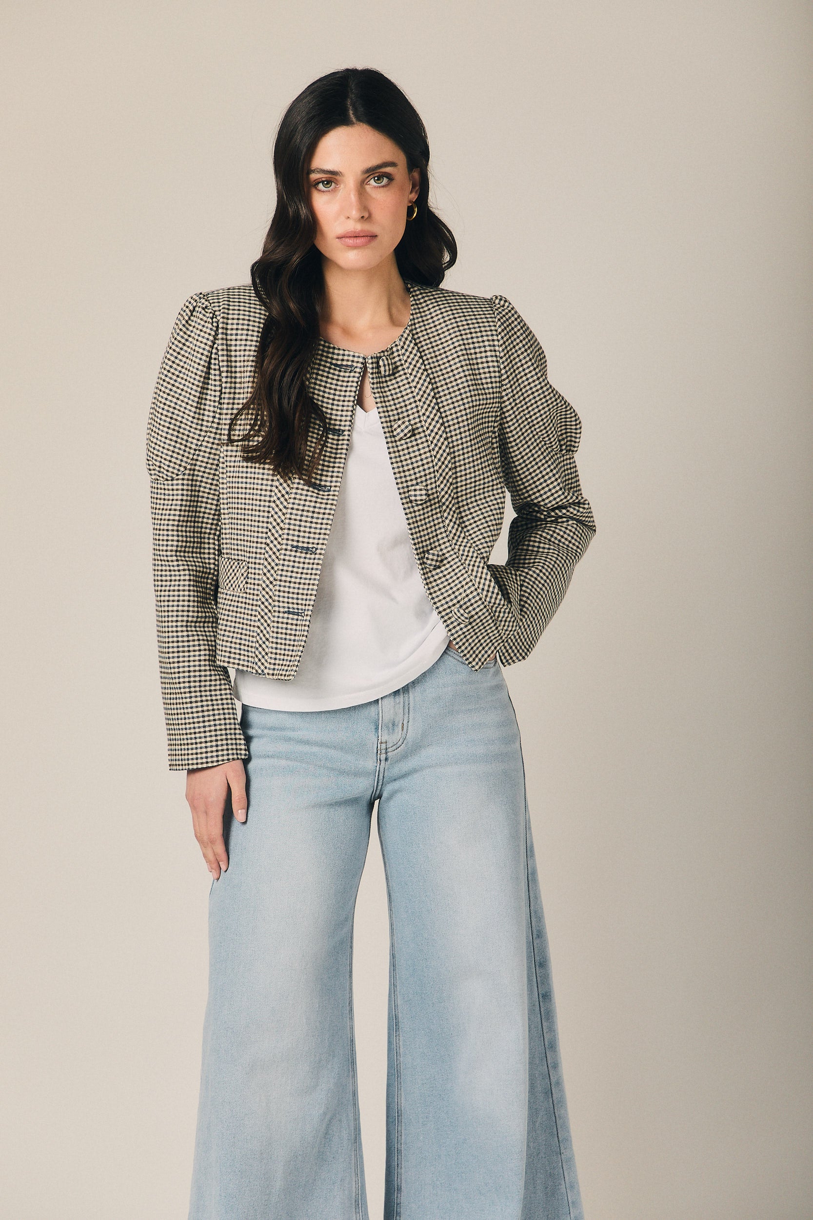 Casaco curto de quadrados em azul-marinho e cru, com corte estruturado e comprimento à cintura que define a silhueta sem pesar. O decote redondo enquadra o colo com sobriedade, enquanto o abotoamento frontal com botões visíveis e os bolsos de chapa funcionais reforçam o carácter de casaco de inspiração sastre. As mangas compridas apresentam um ligeiro volume no ombro, conferindo presença e um cair limpo sobre o corpo.