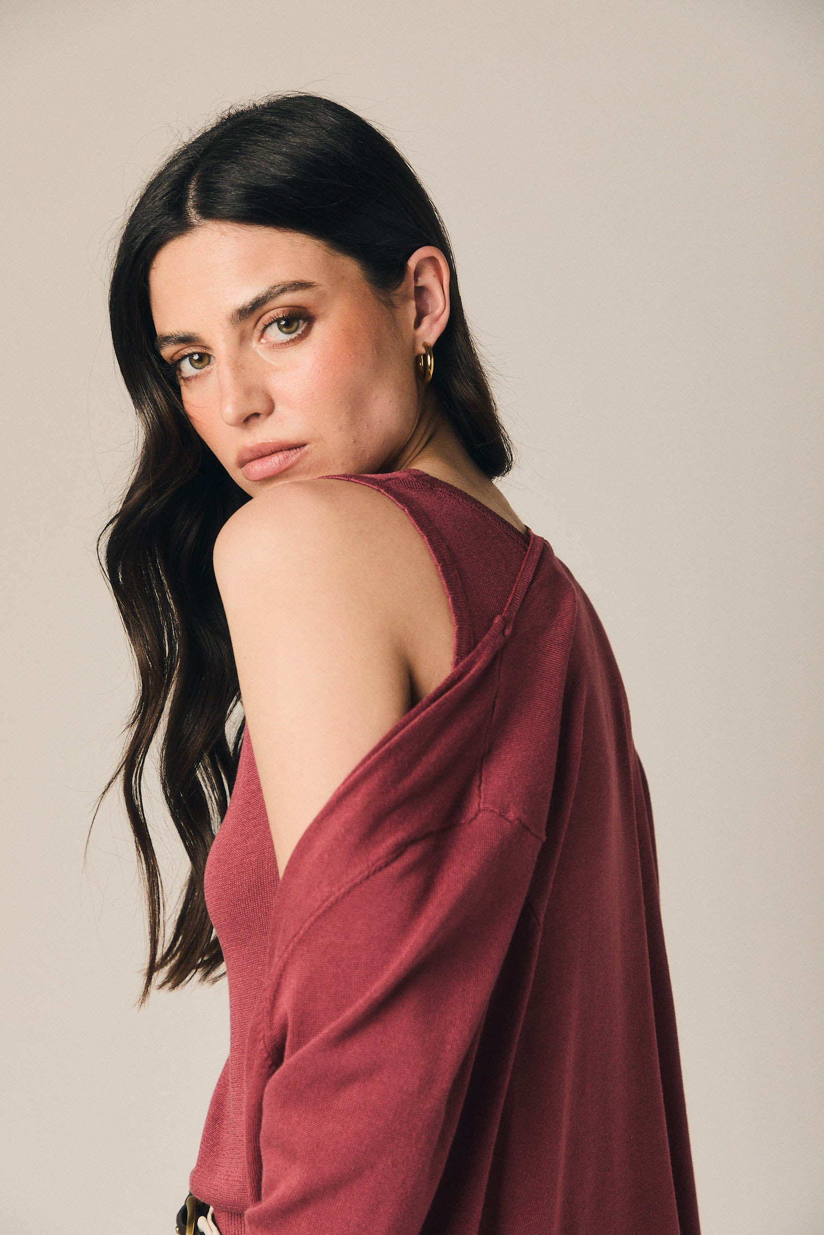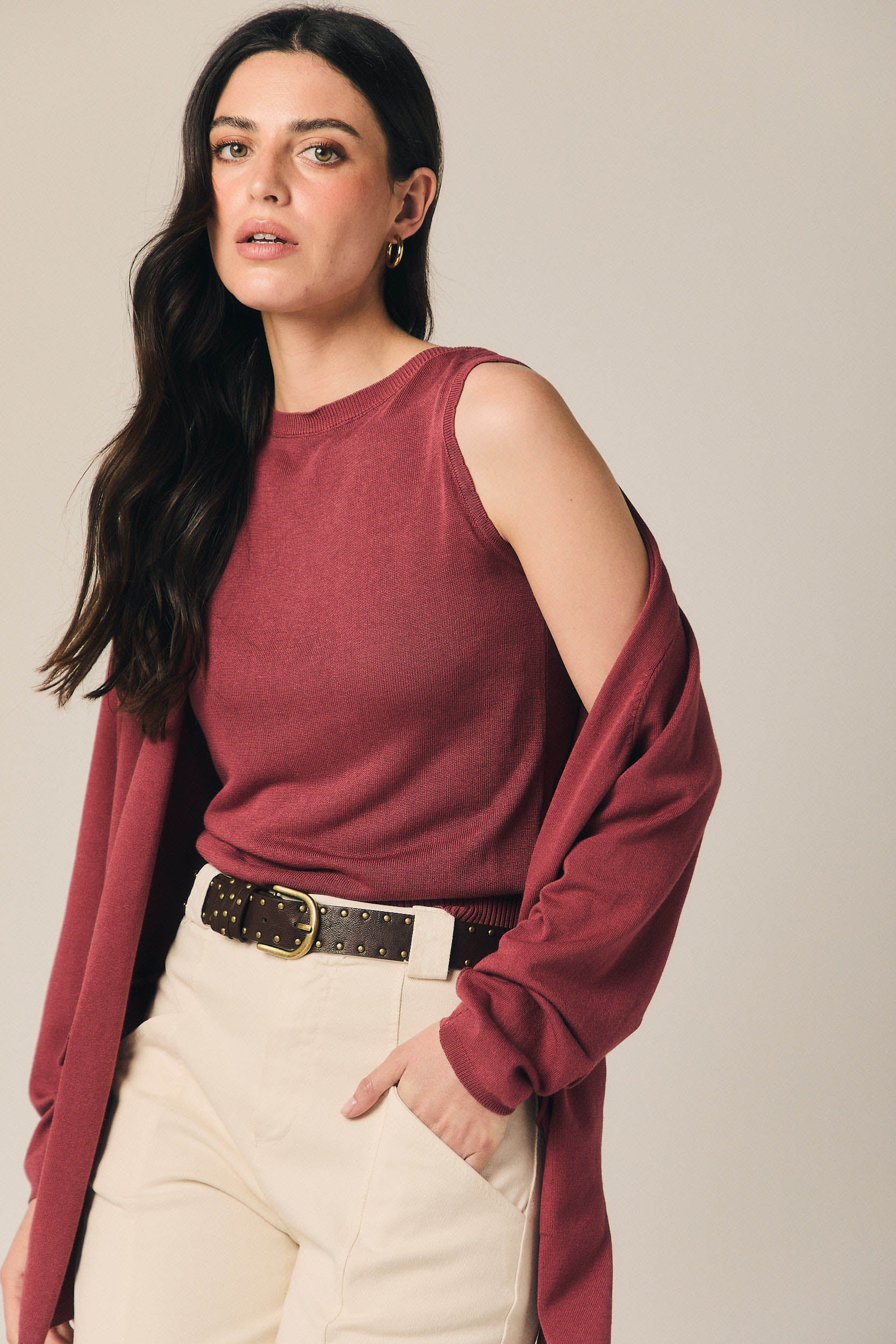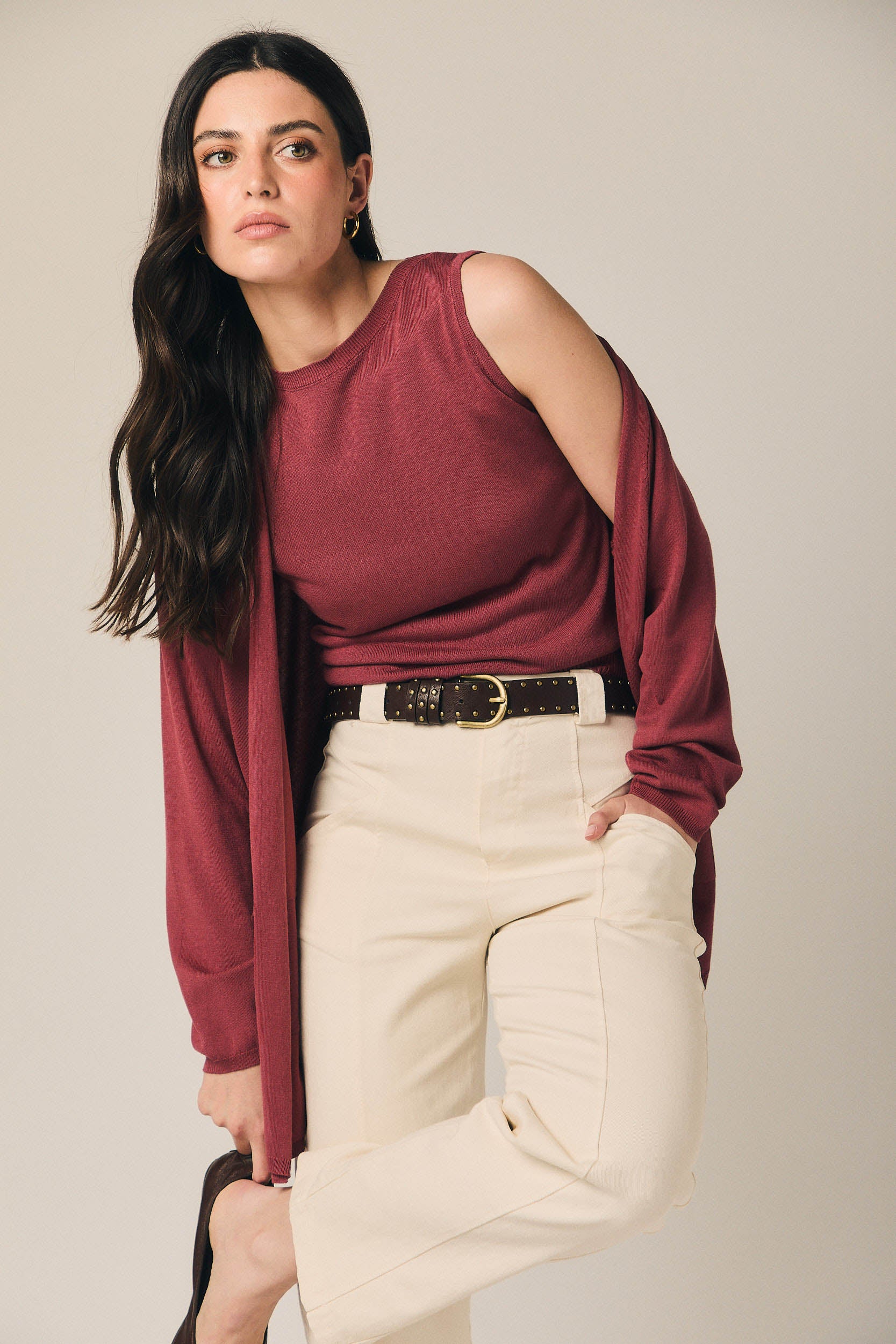 Uma camada leve ideal para dias amenos, perfeito para usar sobre uma t-shirt básica, um top estampado ou uma blusa fluida, tanto no escritório como em momentos descontraídos. O tom vinho combina facilmente com jeans direitos, calças de pinças ou um vestido midi, criando coordenados versáteis que transitam bem entre interior e exterior, sempre com uma elegância serena.