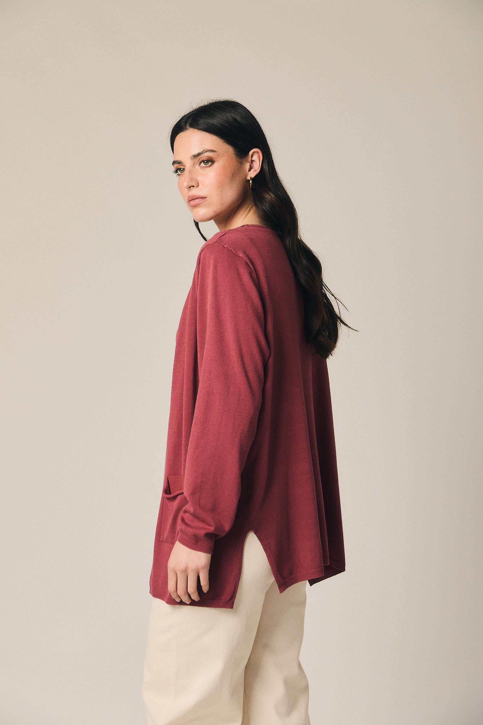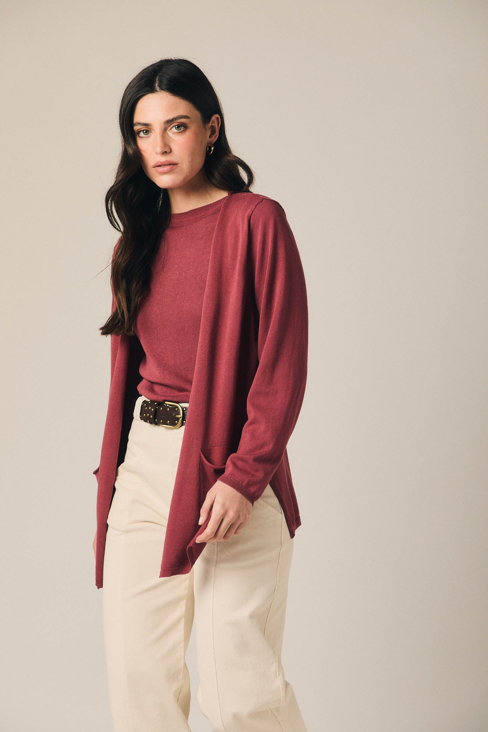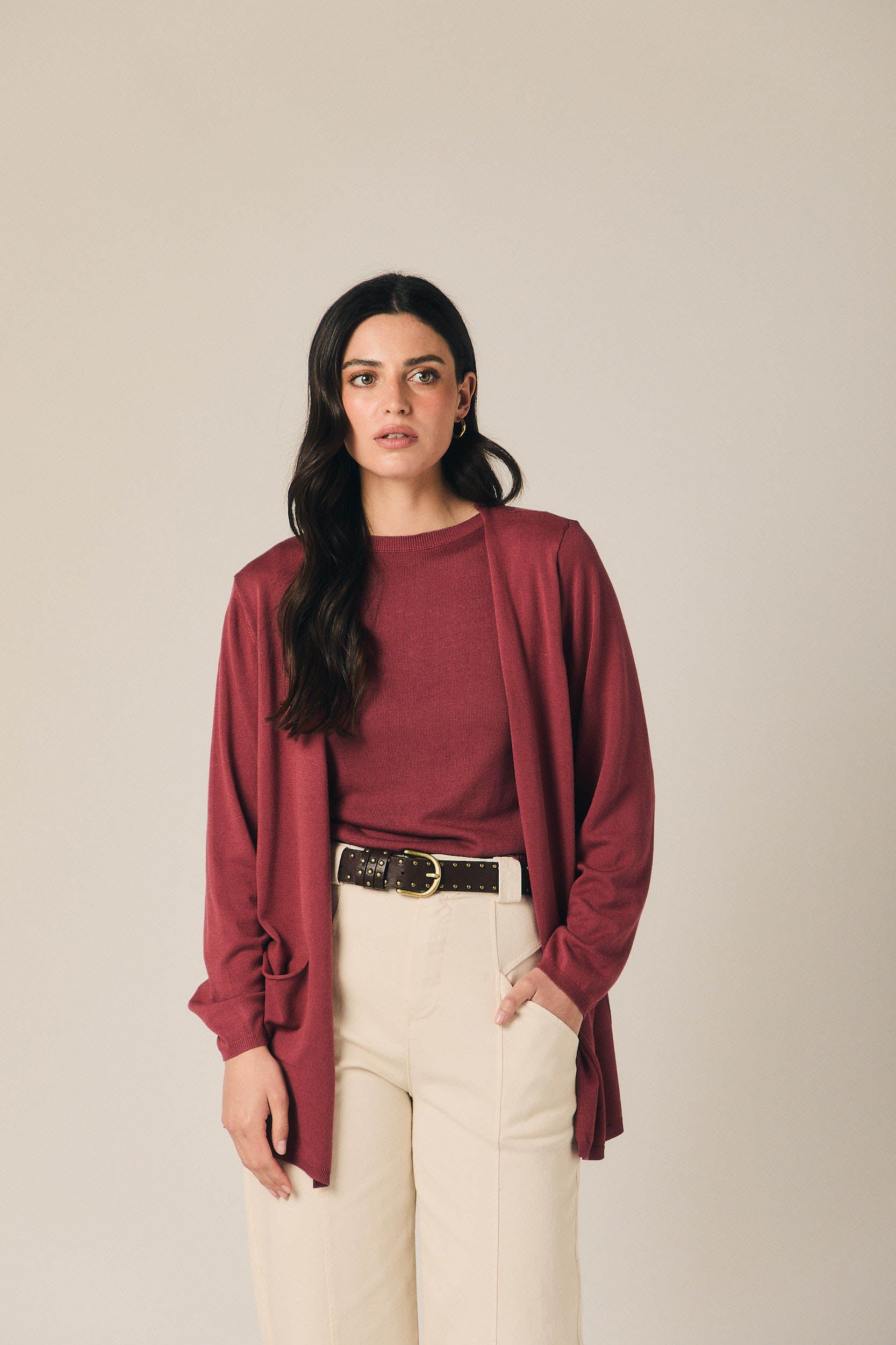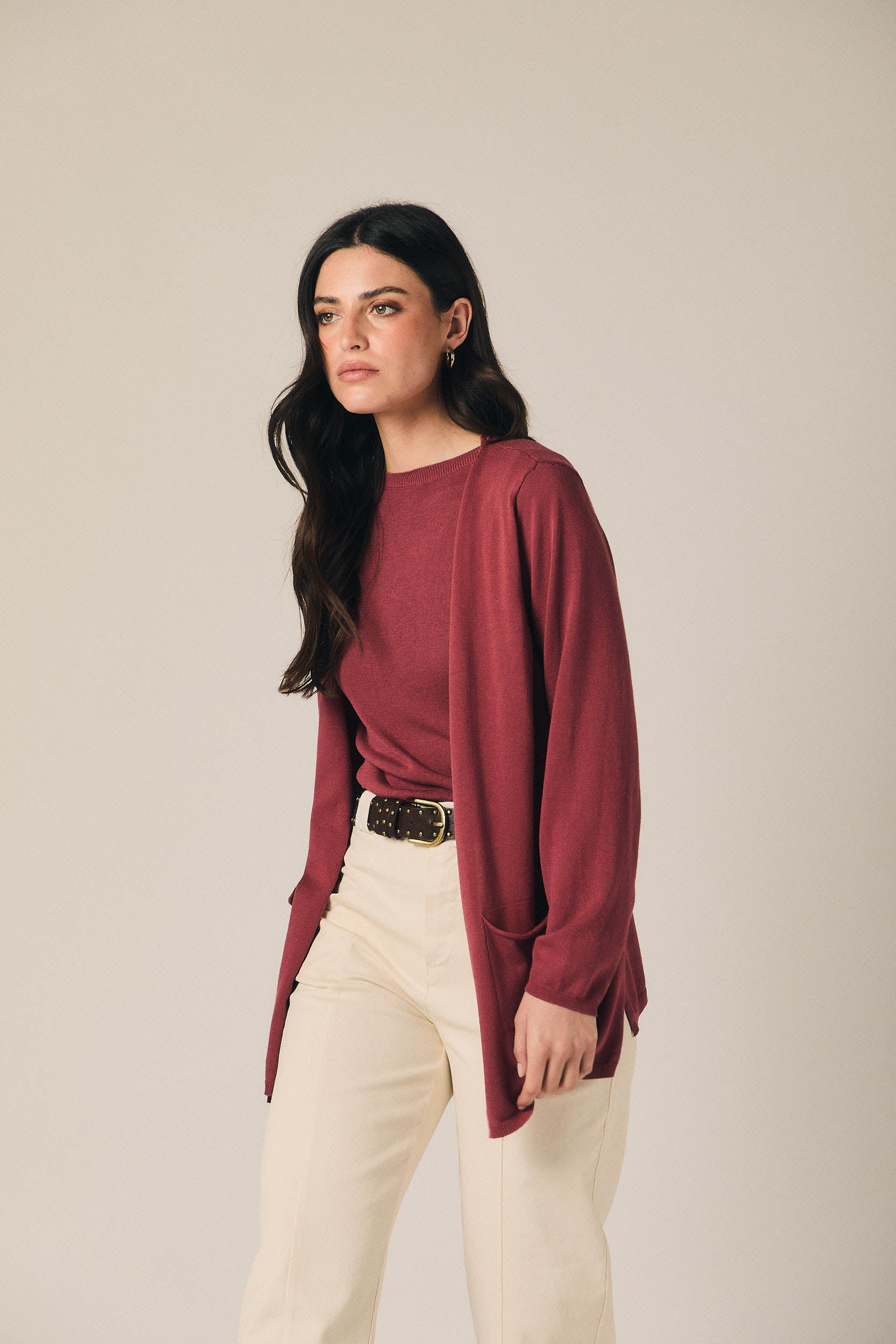 Casaco de malha fino em tom vinho, de corte direito e comprimento pela anca, com desenho aberto sem fecho que cai suavemente sobre a silhueta. As mangas compridas terminam com punho ligeiramente ajustado, garantindo um encaixe discreto, e o baixo reto alonga a linha do corpo. Os bolsos de plastrão à frente acrescentam funcionalidade e um toque descontraído, mantendo um aspeto cuidado.