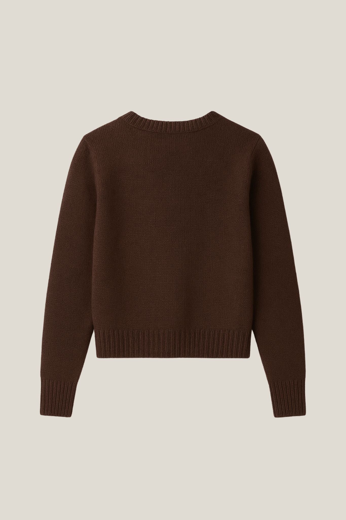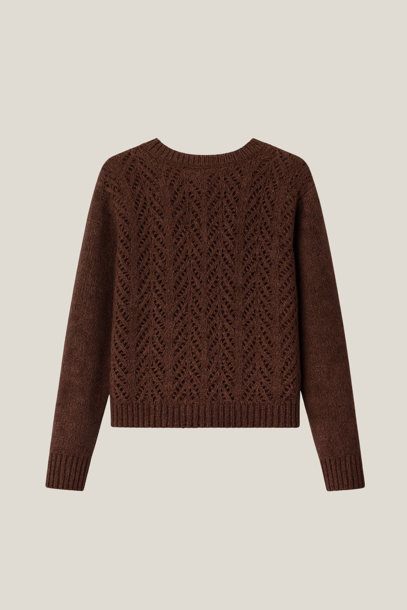 Jersey de punto en tono marrón chocolate con diseño calado geométrico en la parte frontal. Presenta cuello redondo, manga larga y remates de canalé en puños y bajo para aportar estructura. La espalda es lisa, creando un contraste suave y muy favorecedor.