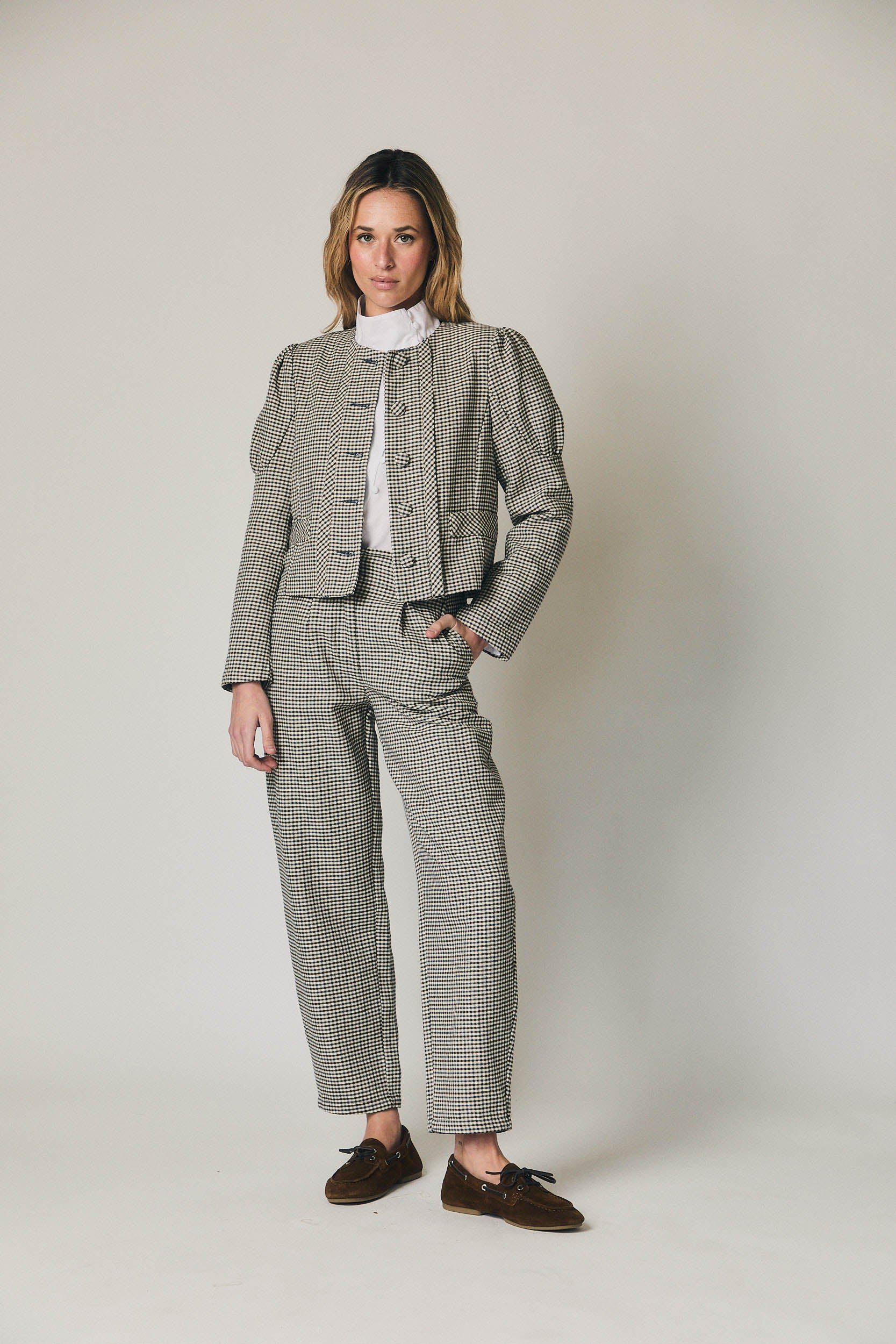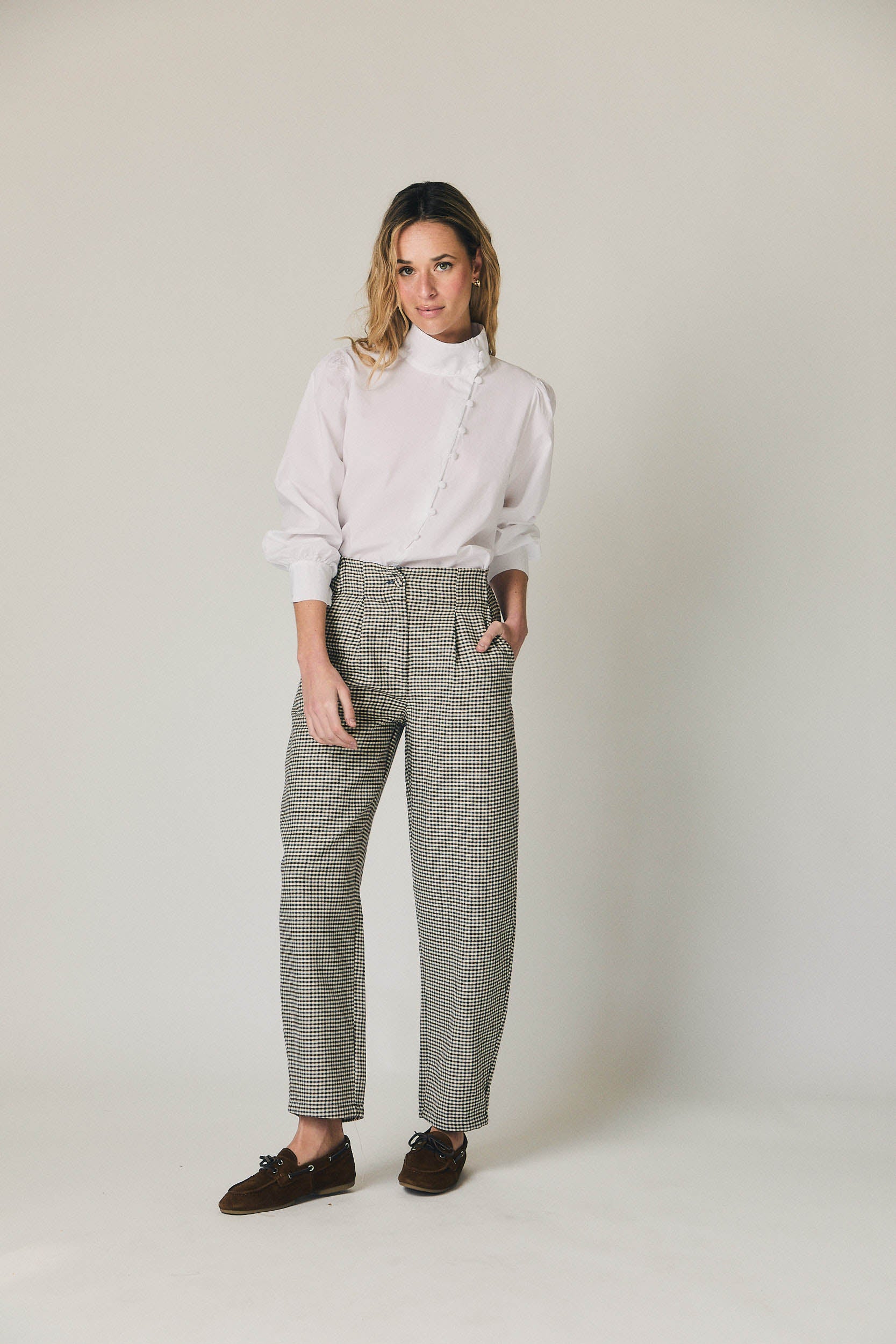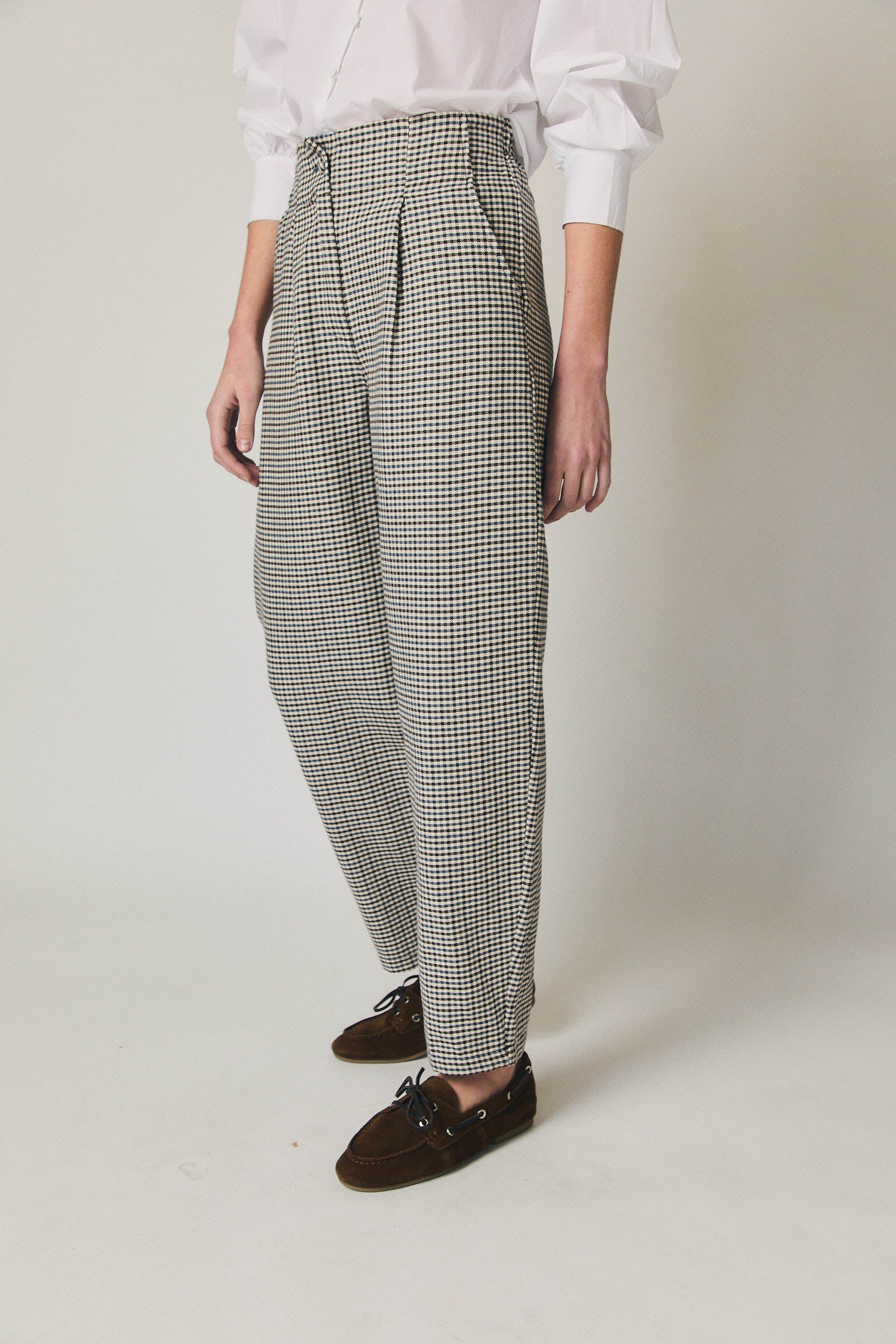 Pantalón de tiro medio con estampado de cuadros en azul marino y crudo. Diseño con pinzas frontales que aportan estructura y favorecen la caída. Pierna recta ligeramente amplia y largo al tobillo. Cierre frontal limpio y bolsillos laterales integrados para un acabado cuidado.
