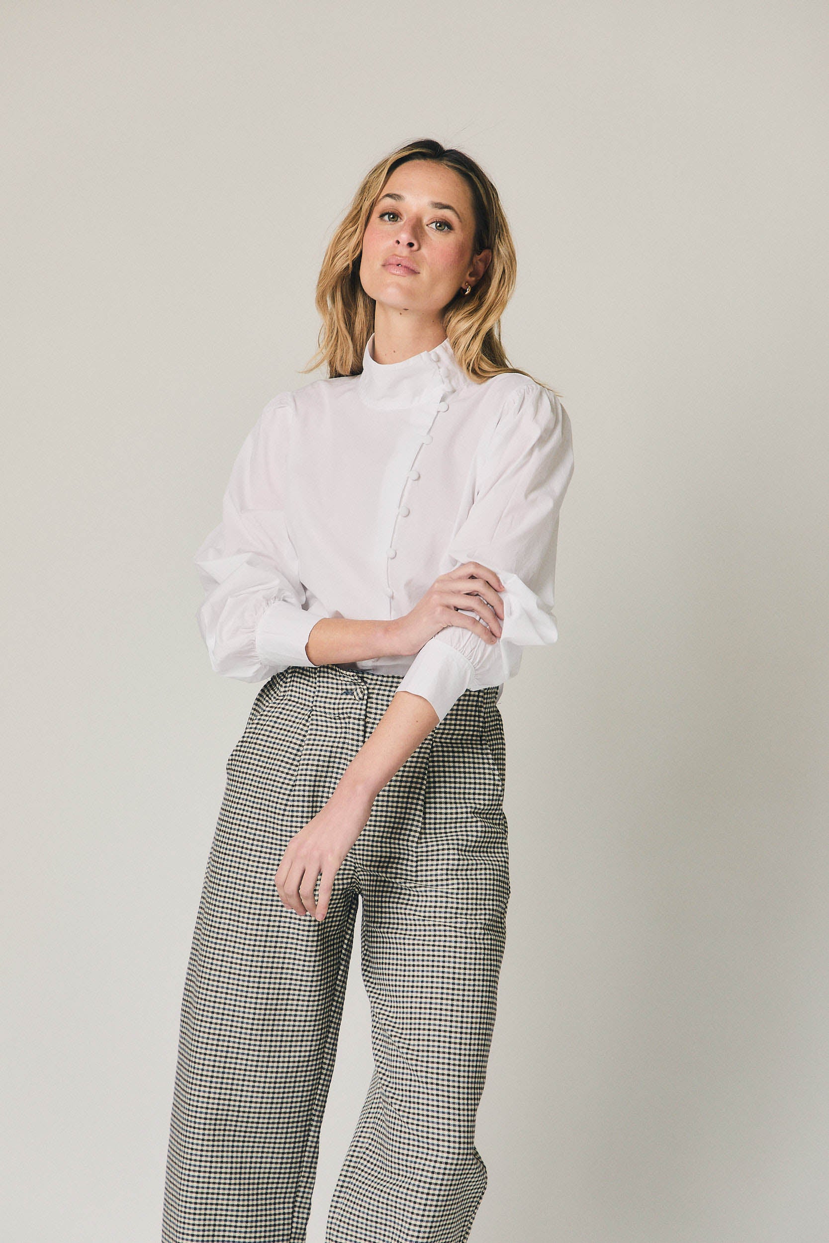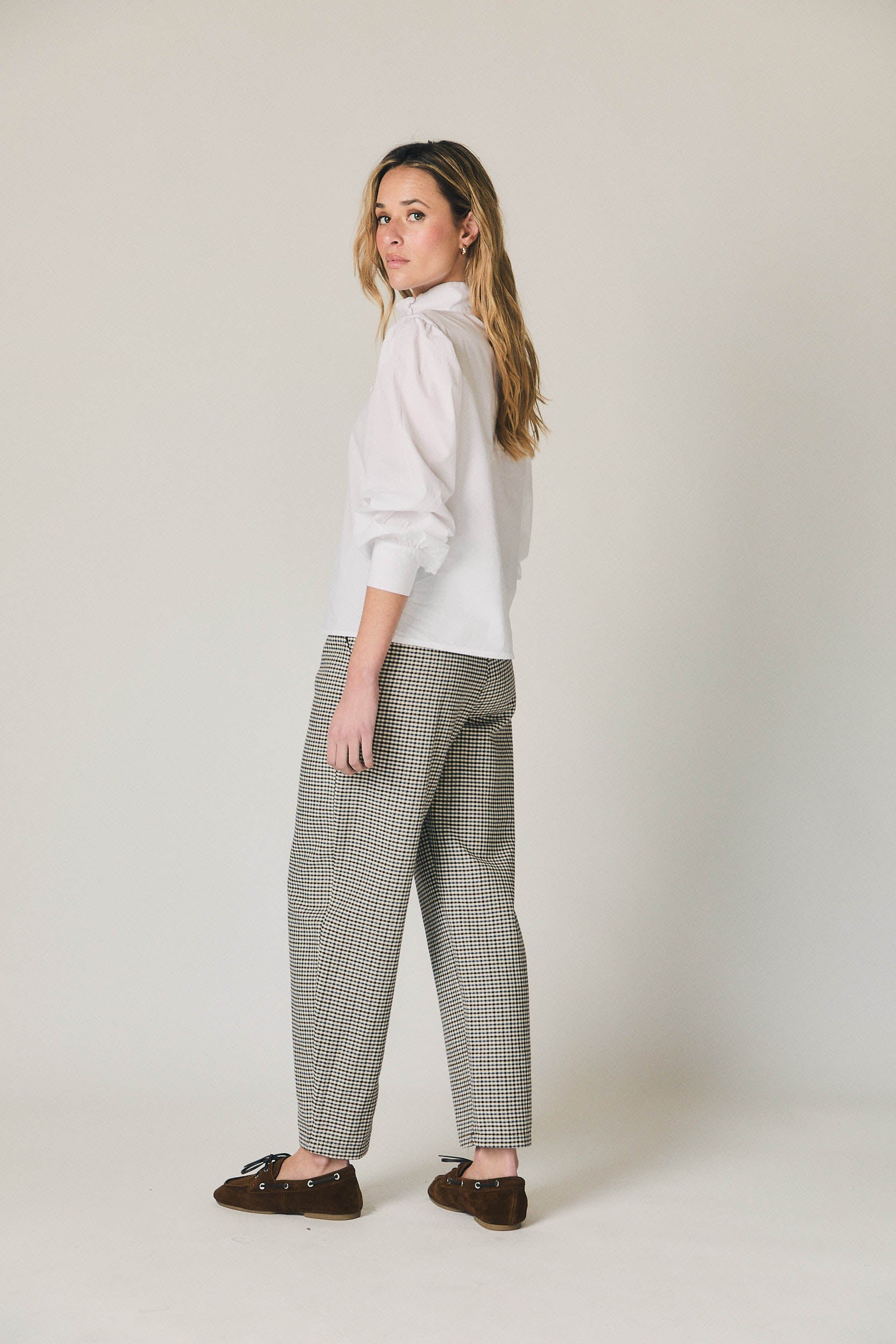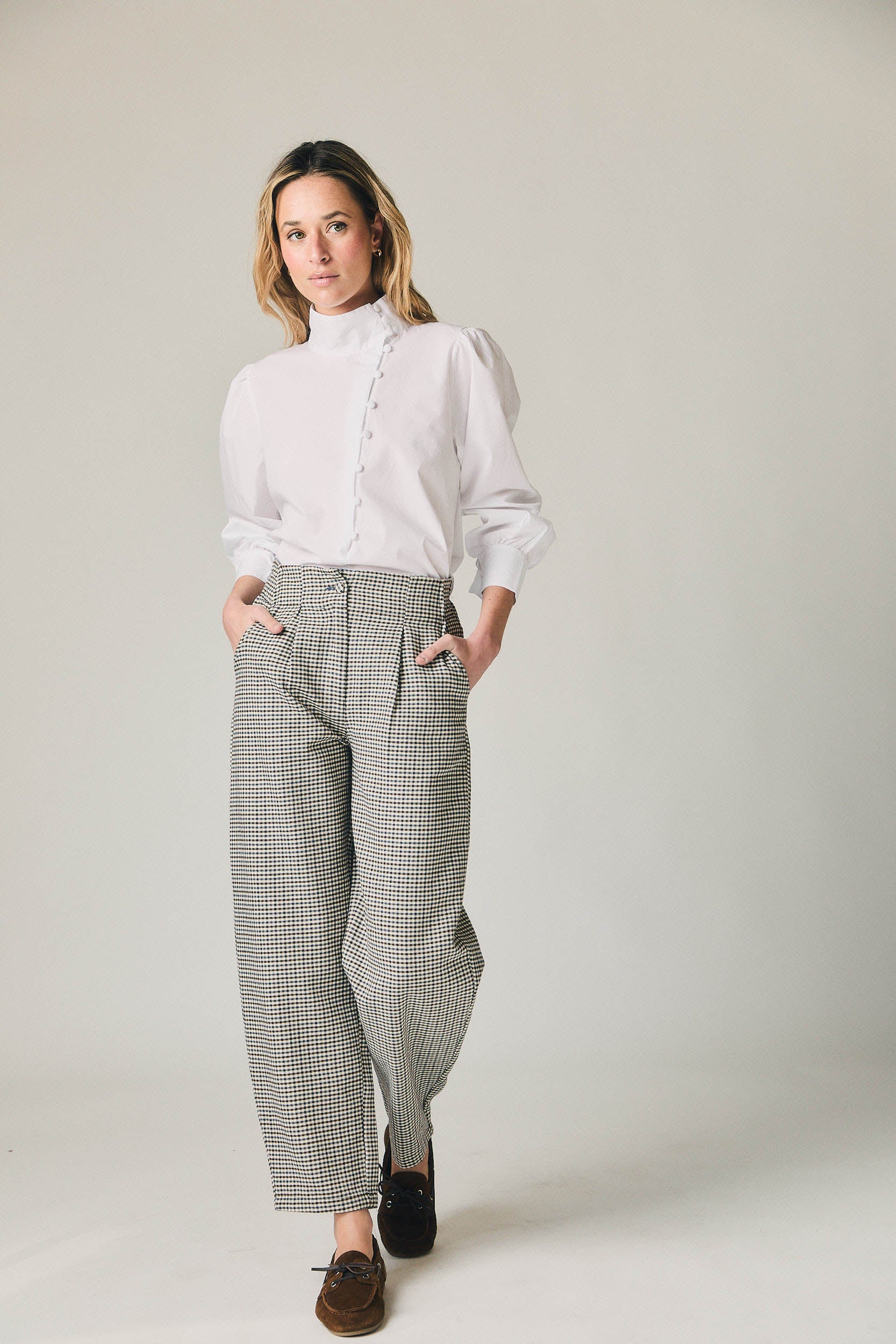 Pantalón de tiro medio con estampado de cuadros en azul marino y crudo. Diseño con pinzas frontales que aportan estructura y favorecen la caída. Pierna recta ligeramente amplia y largo al tobillo. Cierre frontal limpio y bolsillos laterales integrados para un acabado cuidado.