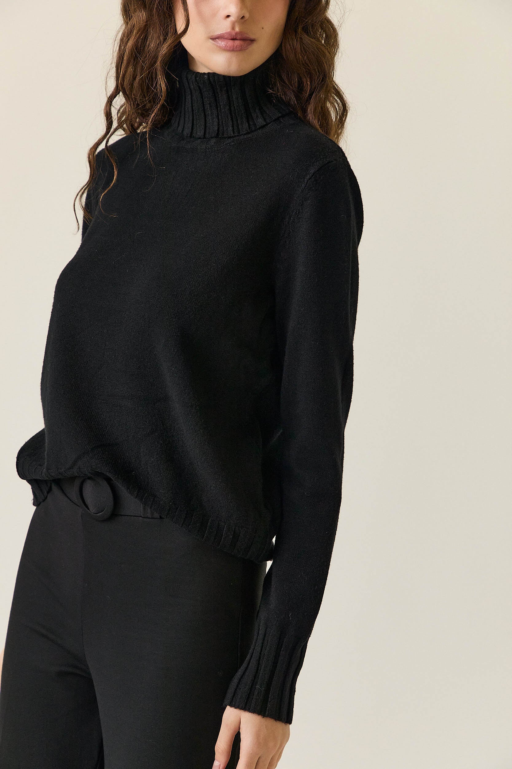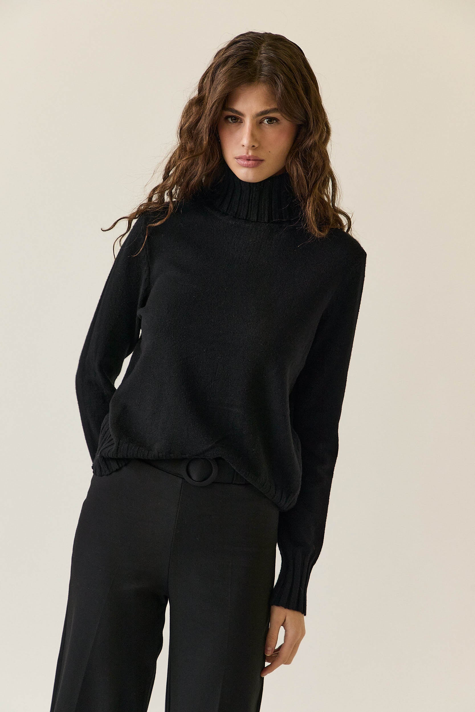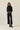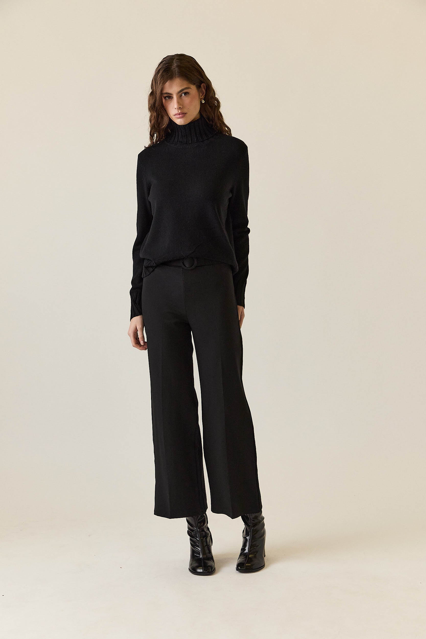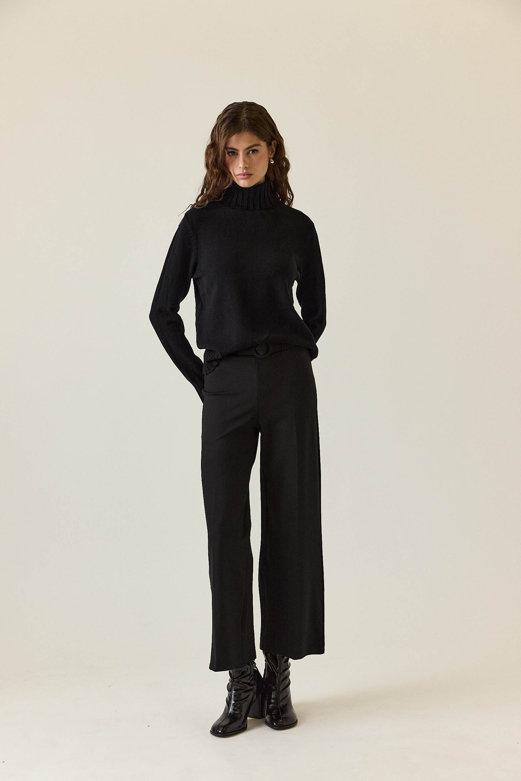 Pantalón negro de corte recto, tiro medio y pernera ligeramente amplia. Presenta un cierre limpio y un cinturón del mismo tono con hebilla redonda forrada, que aporta un acabado uniforme. La cintura queda definida sin perder comodidad y el bajo recto alarga visualmente la silueta.