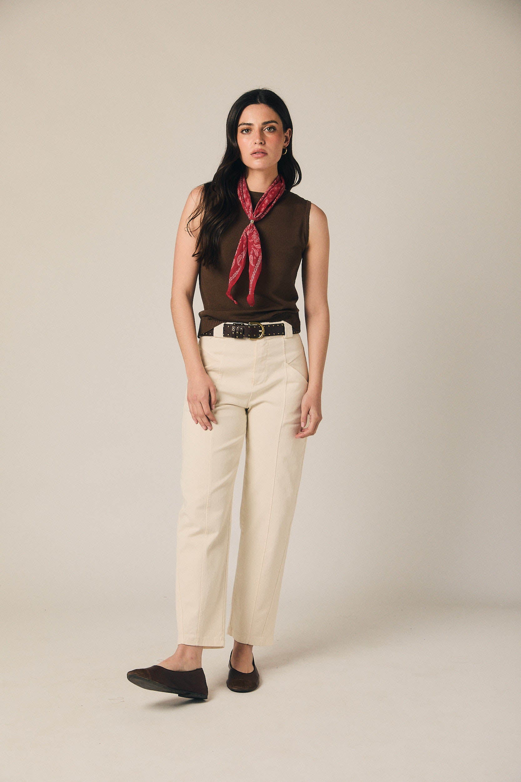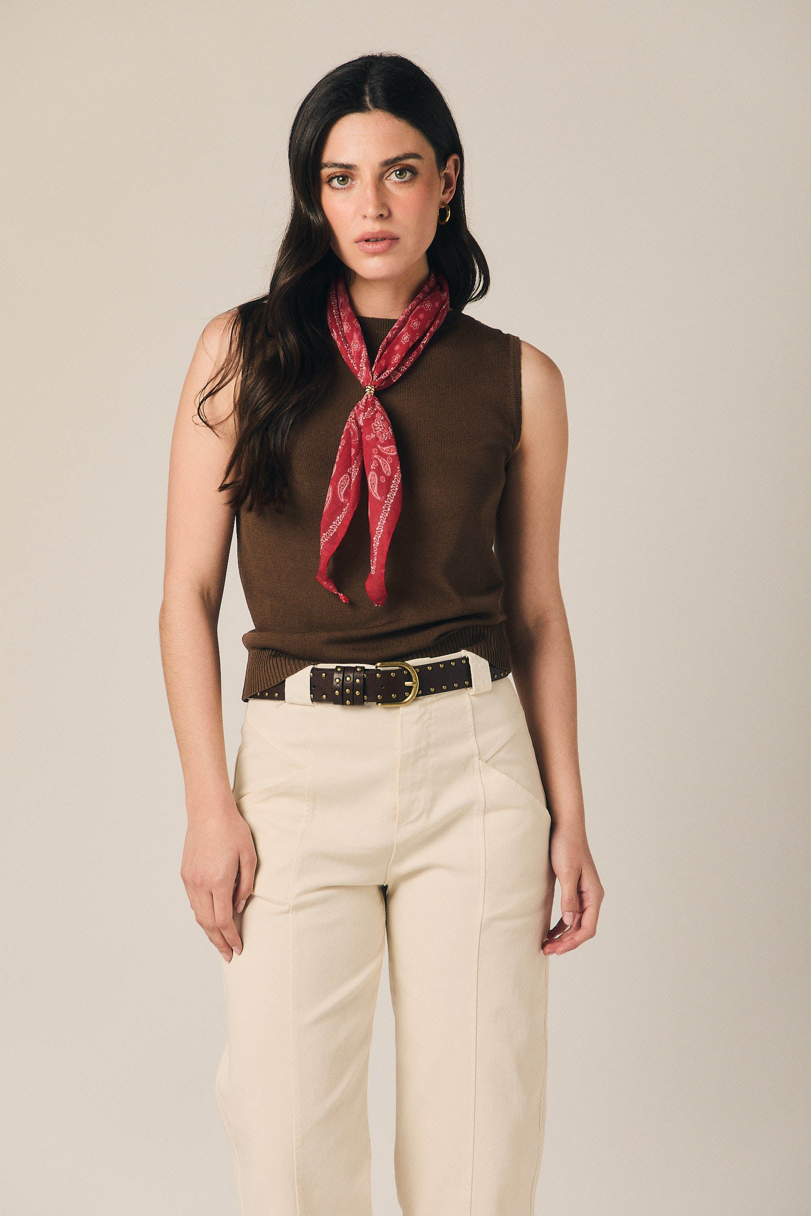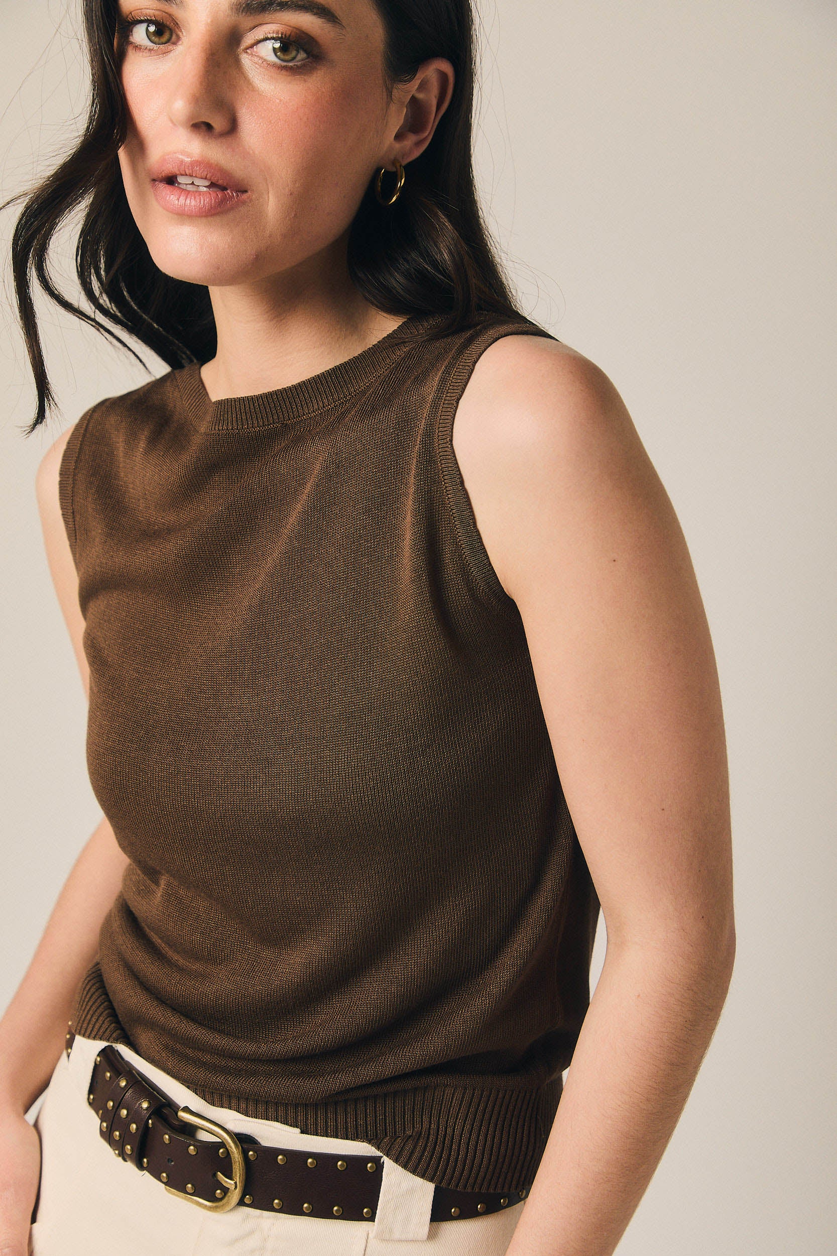 Top de malha fina castanha, de corte direito e sem mangas, com decote redondo subido que enquadra discretamente a zona do pescoço. O desenho limpo é valorizado por um detalhe central vertical que alonga a silhueta e por um acabamento ligeiramente canelado e elástico na bainha, que assenta junto ao corpo sem marcar.